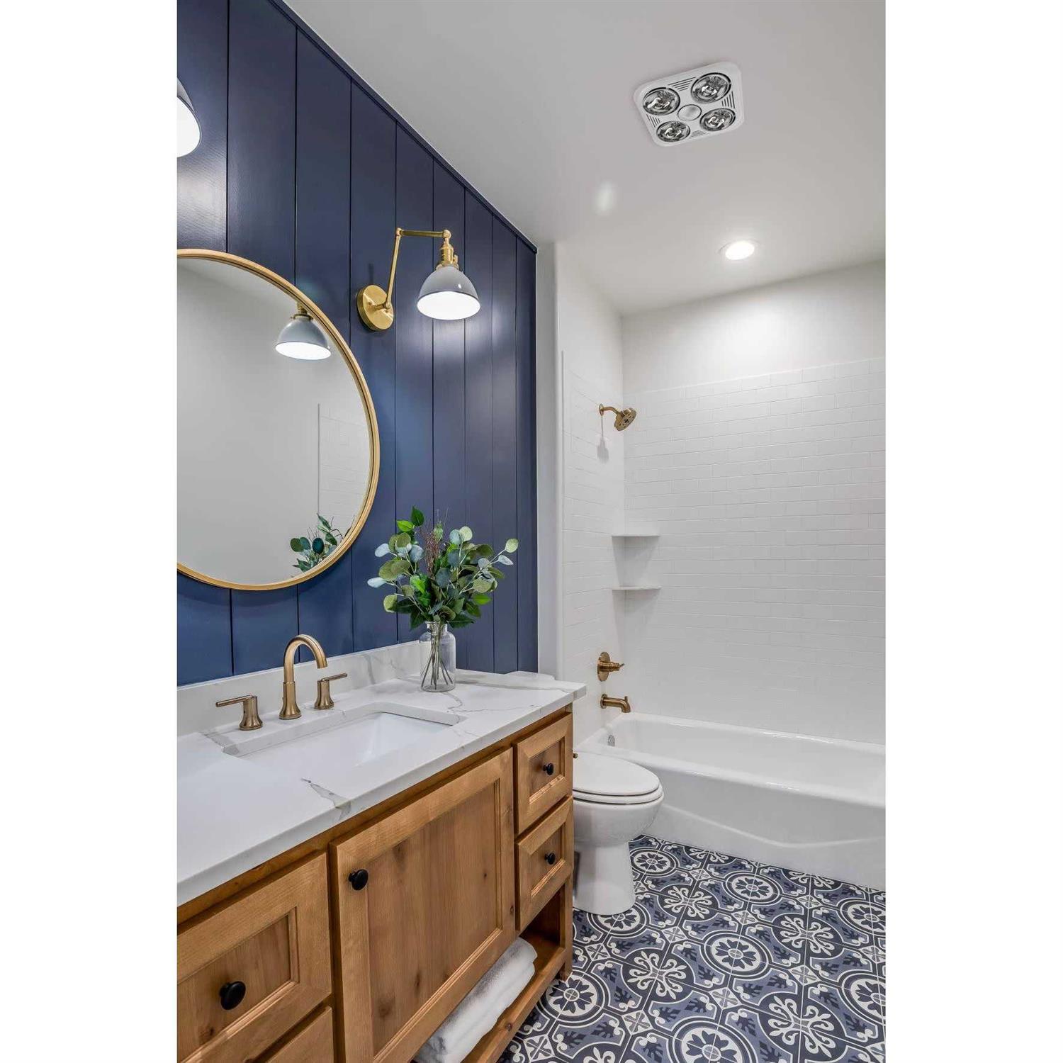 The A716R Exhaust Fan with Heater and Light combines a low-noise bathroom ventilation fan with a powerful, efficient heater and a light, providing immediate warmth when you step out of the shower while quietly clearing excess moisture. Four anti-blast infrared heat lamps provide maximum warmth throughout the bathroom. Two or four lamps can be turned on for varying heat levels. The fan, heater and light may be wired separately, and a 4-function wall switch is included. The four heat lamp bulbs and a 60W incandescent light bulb are also included. This IC-rated fixture is suitable for new construction or remodel applications and fits with 2 x 8 inch joists. Articulating expandable anti-vibration brackets and a connector for 4 inch ducts are included. The fixture has rust-proof steel motor housing, a built-in backdraft damper and thermal shutoff. It cannot be installed directly over a tub or shower enclosure. UL listed when used with GFCI branch circuit wiring. Note: Requires a 15 amp circuit.