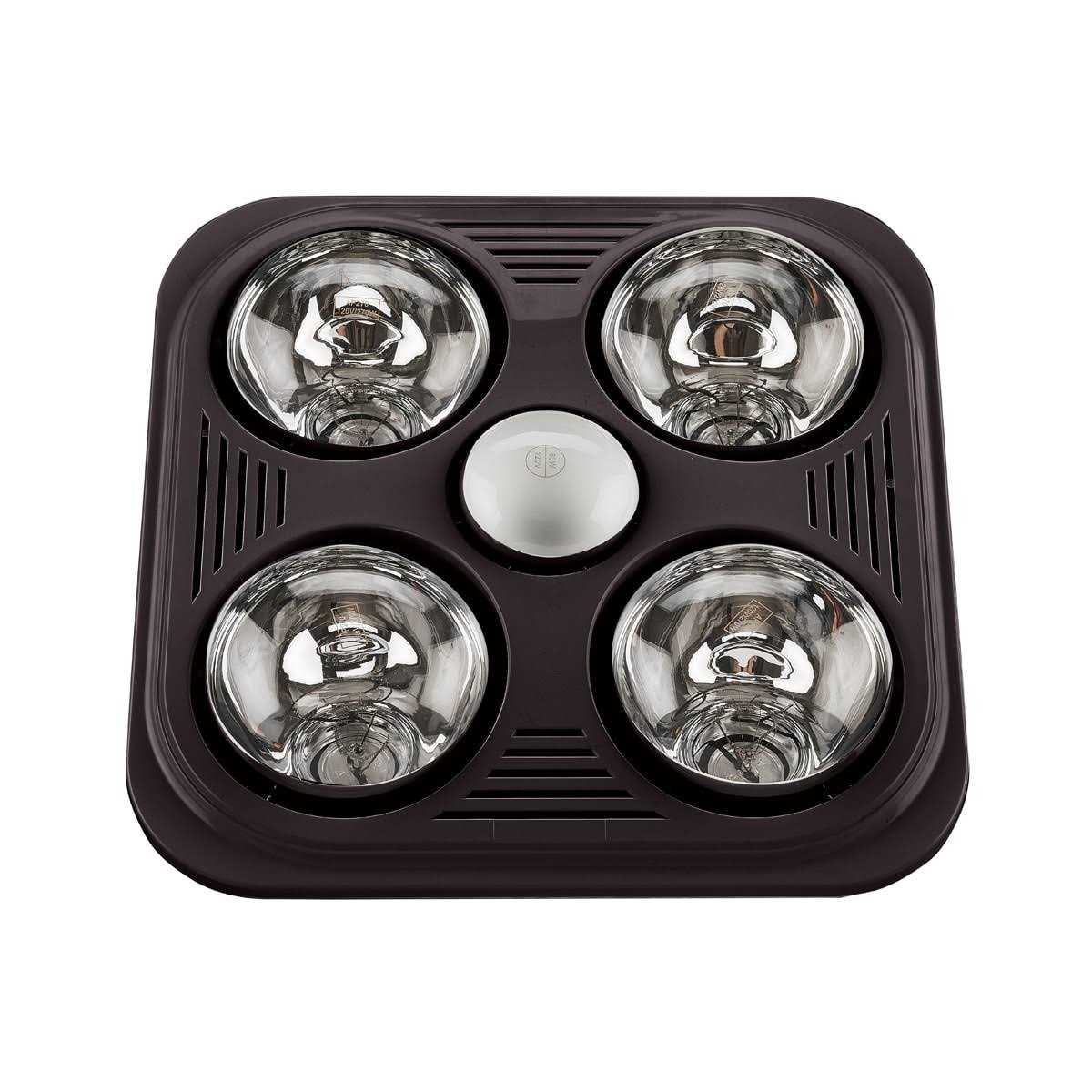 The A716R Exhaust Fan with Heater and Light combines a low-noise bathroom ventilation fan with a powerful, efficient heater and a light, providing immediate warmth when you step out of the shower while quietly clearing excess moisture. Four anti-blast infrared heat lamps provide maximum warmth throughout the bathroom. Two or four lamps can be turned on for varying heat levels. The fan, heater and light may be wired separately, and a 4-function wall switch is included. The four heat lamp bulbs and a 60W incandescent light bulb are also included. This IC-rated fixture is suitable for new construction or remodel applications and fits with 2 x 8 inch joists. Articulating expandable anti-vibration brackets and a connector for 4 inch ducts are included. The fixture has rust-proof steel motor housing, a built-in backdraft damper and thermal shutoff. It cannot be installed directly over a tub or shower enclosure. UL listed when used with GFCI branch circuit wiring. Note: Requires a 15 amp circuit.