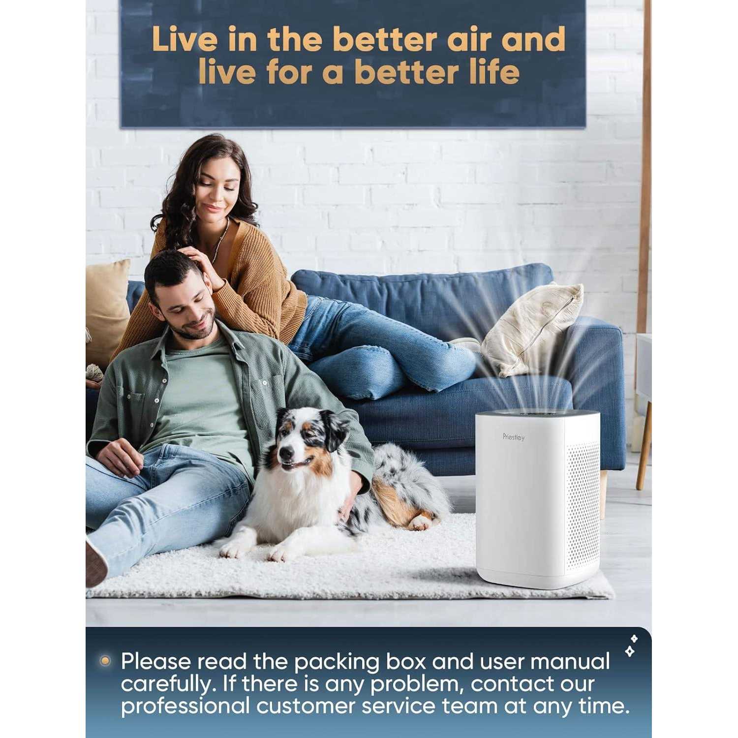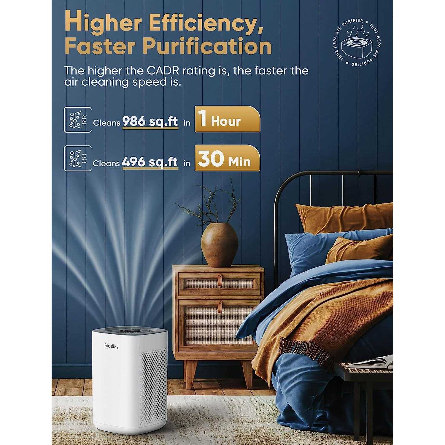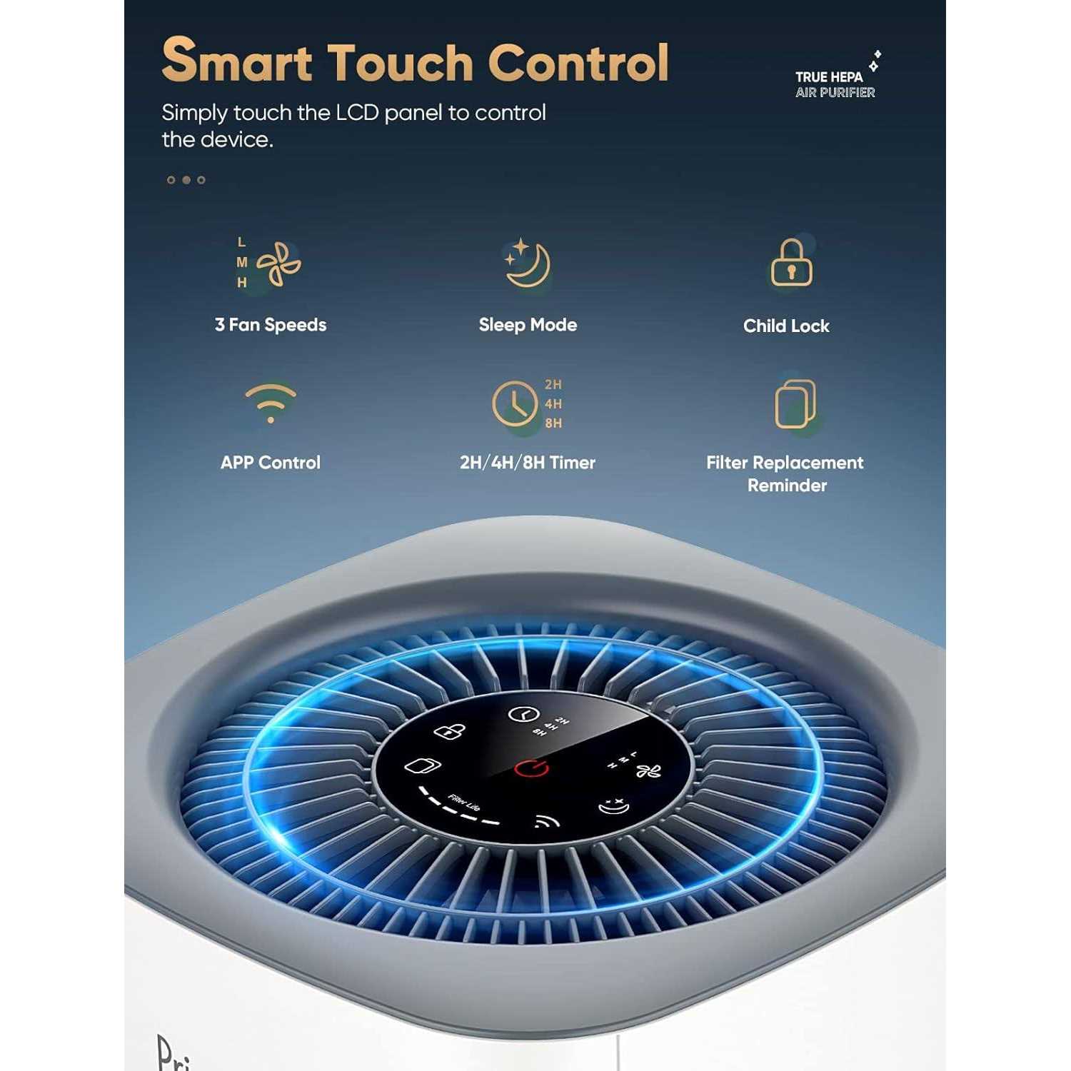 High-Efficiency Air Filtration, Whole-House Purification. Ten minutes of use changes the air quality significantly, ideal for enclosed rooms like living rooms or bedrooms. 3-Level Fan Speed, 3-Stage Filtration System. Adjust the fan speed(low, medium, high) for different room sizes. A pre-filter traps larger particles, including human hair, fibers, pet fur, and dust particles. A true HEPA filter removes 99.97% of airborne particles sized 0.3 microns, like PM 2.5, dust, smoke particles, pollen, and other pollutants. A carbon filter absorbs/eliminates fumes and volatile organic compounds in the air. Smart Touch Control, Smart APP Control. Touch screen backlit LCD display makes it easy and convenient to control. Support wireless control by the app on your phone. Control the device to turn on/off remotely. Share the device with your family to ten people at most. Lock the screen with the child lock function to avoid misoperation by kids/pets. Considerate Sleep Mode, Convenient Timer Function. The air purifiers for bedroom run at an ultra-low noise level of 24dB. Before sleep, turn on the sleep mode with low fan speed and backlit off, not disturbing your quietness. Timer setting varies from 2-4-8H to turn on/off the device. Set the boot time and feel the fresh air once getting home. Filter lifespan extends to 3000 hours, each lasting for 3-6 months, depending on the environment. Change the filters(Search for B0BCHVSWJT) in time to ensure air filtration performance.