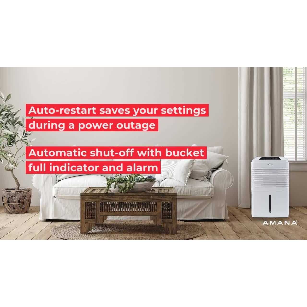 The Amana 35-pint portable room dehumidifier removes up to 35 pints of moisture from the air per day. Featuring an adjustable humidistat to set for your own comfort level and a Bucket full auto-shutoff indicator letting you know when it’s time to empty. Plus, touch controls with LED display, 2 fan speeds, and 24-hour on/off timer. Easy-rolling caster wheels allow you to conveniently move the unit from room to room, providing relief when and where you need it. Amana is here to help you care for your home and family.