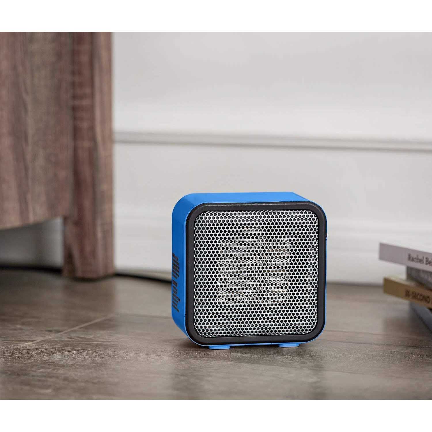 Compact personal space heater in Blue; small enough for tables or desktops 500 watts of power; efficient ceramic coils heat up in seconds Tip-over protection for extra safety Product Dimensions: 3.2 x 5.9 x 6 inches (LxWxH)