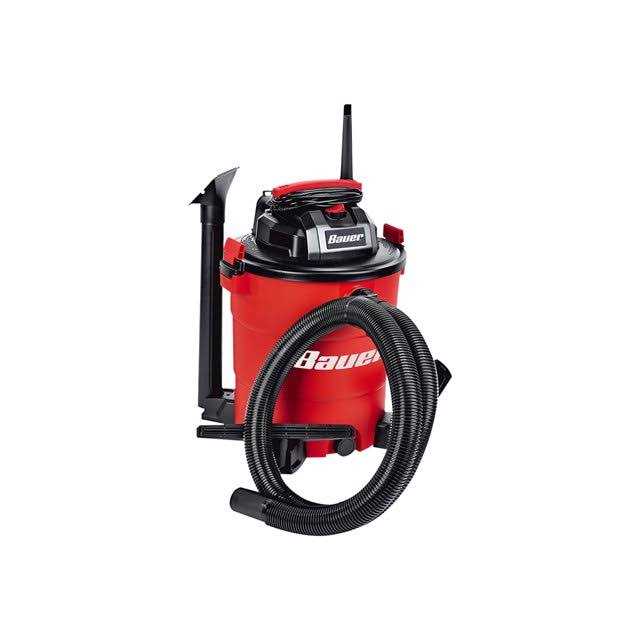 The Bauer 14-gallon wet/dry vacuum cleaner offers 6 peak horsepowers of suction for cleaning up liquids and spills. Includes convenient onboard storage for keeping accessories organized.