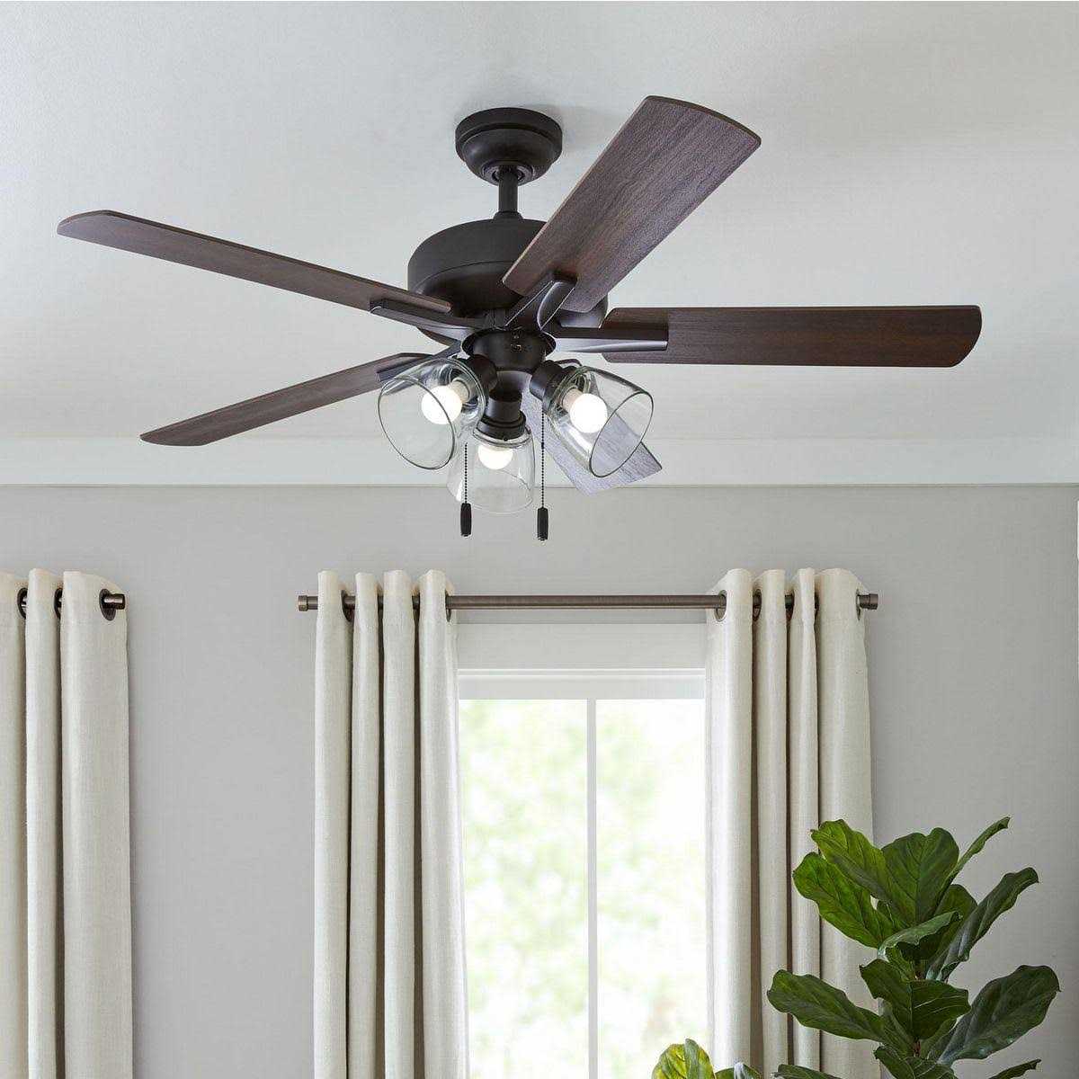 The Better Homes & Gardens Bennett 52 inch 3 Light, 5 Blade Ceiling Fan in Bronze with Reversible Blades is the perfect addition to transitional spaces, serving up both powerful air flow and a fresh take on a classic style. With three pull-chain adjustable speed settings, this down rod fan is sure to deliver a high quality, quiet performance while saving energy both in the summer and winter months. Easy installation can be mounted on a sloped ceiling.