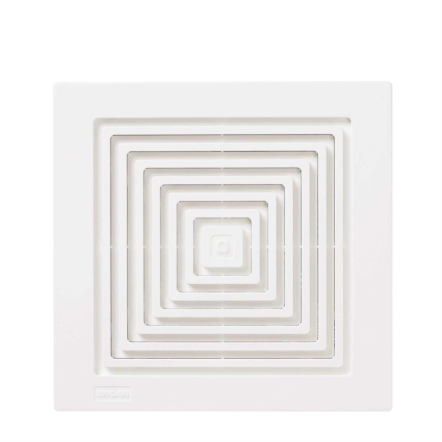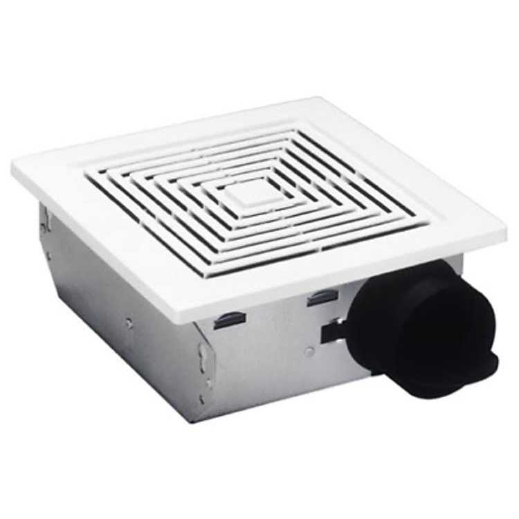 Sones for bathrooms up to 45-sq ft, 9-1/4 inch x 9-inch spring-mounted polymeric grille can be ceiling or wall mounted, lifetime lubricated plug-in motor, installs in 3-inch round duct, high-galvanized steel housing, UL listed for use over tub/shower enclosures with GFCI protected branch circuit.