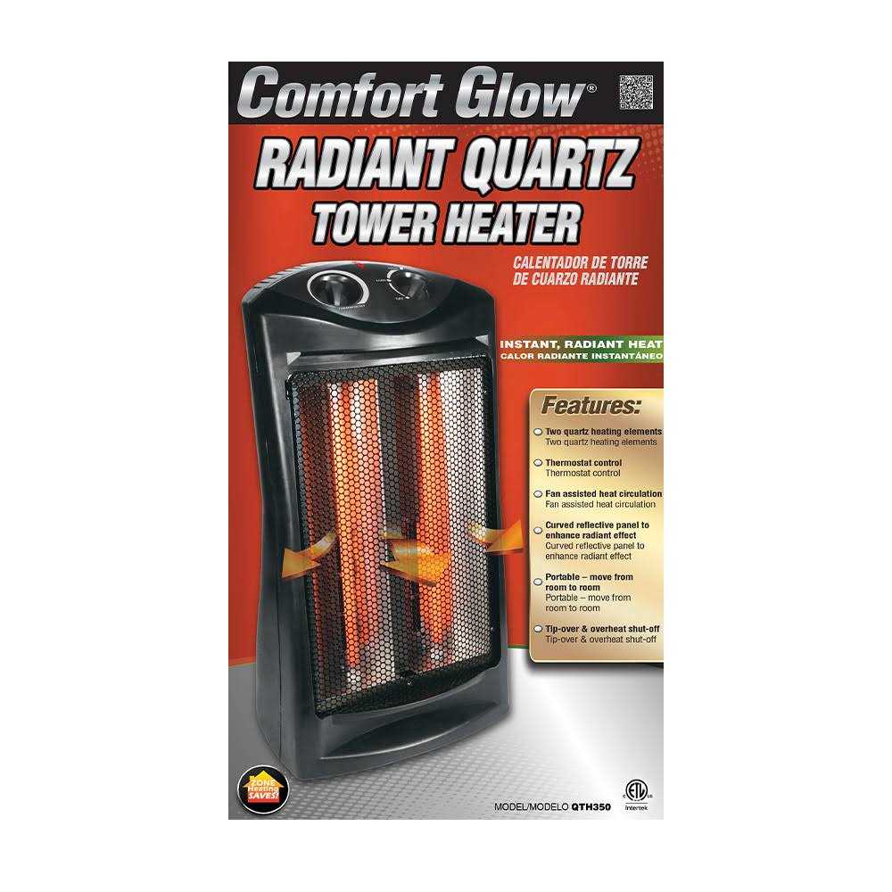 The Comfort Glow infrared quartz tower heater with dual quartz heating elements provides instant infrared radiant heat. An excellent source of supplemental heat for almost any room in your house. A curved radiant panel enhances the radiant heating effects. Easily move this unit from room to room with its built-in handle. Safety features include a tip-over shutoff and an overheat sensor, which shuts the unit down if the internal temperature gets too high. The combination of power and safety features makes this tower heater a perfect choice for your home or office!