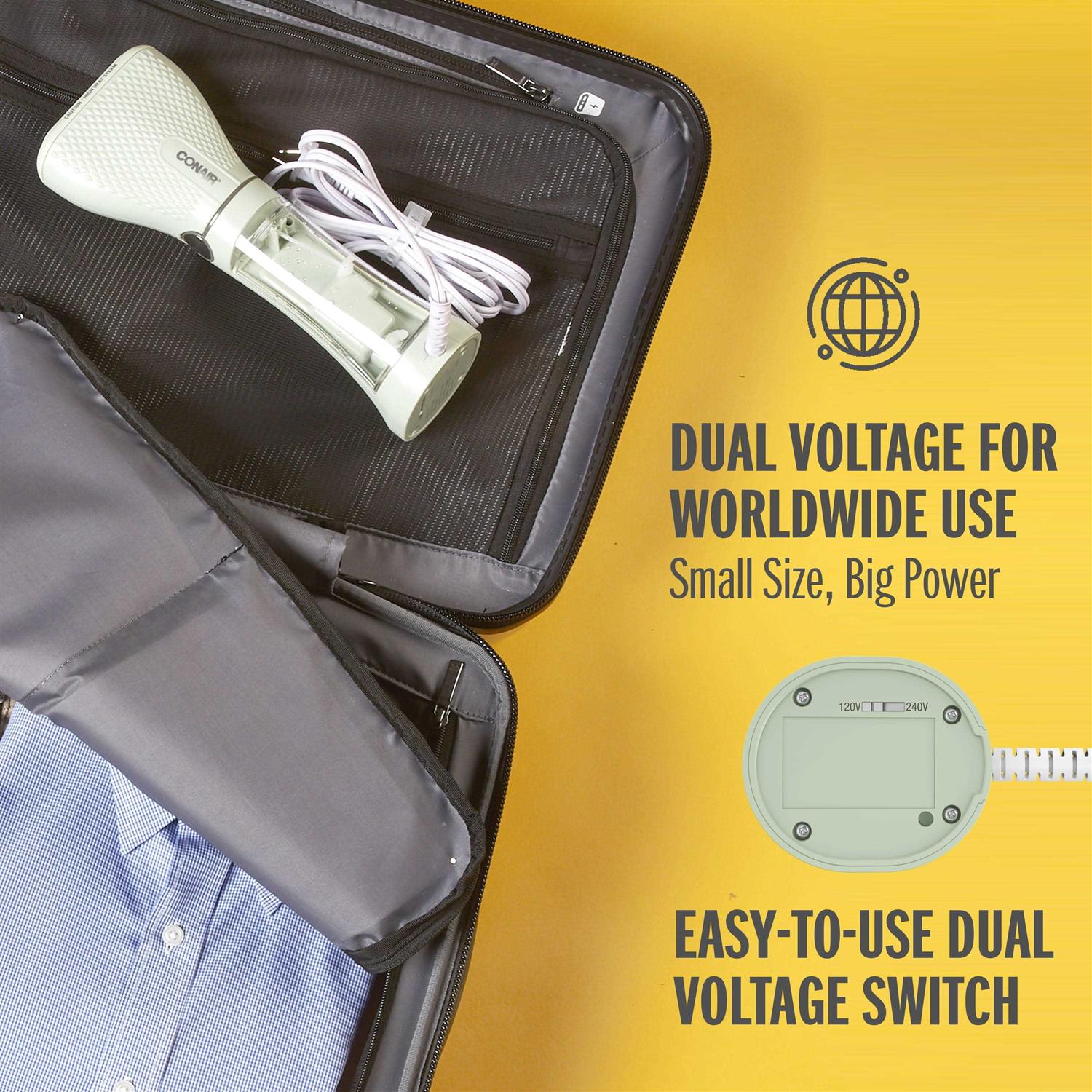 Perfect for on-the-go wrinkle removal and freshening, the small-yet-mighty Power Steam Travel Garment Steamer by Conair features dual voltage for worldwide use. It obliterates wrinkles and kills 99.9% of bacteria with 1200 watts of power that produces high heat and high-velocity steam. Get the job done quickly with an easy-to-fill water reservoir and fast 35-second heat-up. An adjustable steam head makes it easy to reach every angle for all-over smoothing that keeps you looking flawless from head to toe. The compact, lightweight steamer fits easily in your gym or overnight bag so you can look sharp wherever you travel. And with dual voltage, the steamer automatically adapts for worldwide use. Bonus collapsible travel hanger included. Based on third-party test report for efficacy on E. coli when used under enclosed instructions.