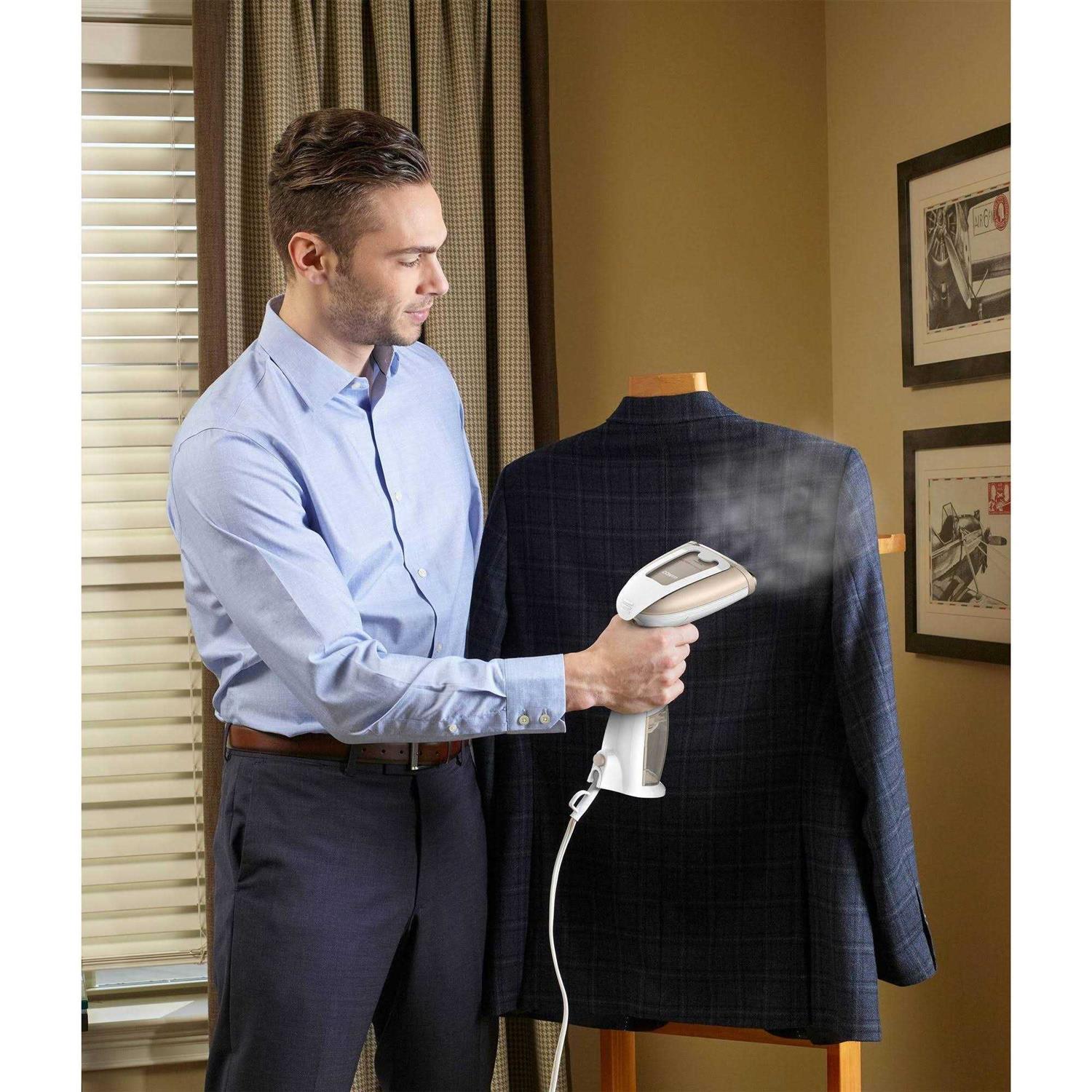 Eliminate wrinkles at home or on the go! Its heated dual-slotted ceramic-coated aluminum sole plate lets you use it as a steamer AND an iron. It heats up in just 40 seconds and gives you up to 20 minutes of steam. Has 5 steam settings from delicate to turbo. Includes built-in creaser, bristle brush, delicate fabric spacer and silicone band attachment (keeps fabric taut). 9′ cord. 6 1/2 w x 12 h x 5 d. | Conair Turbo Extreme Steam, White