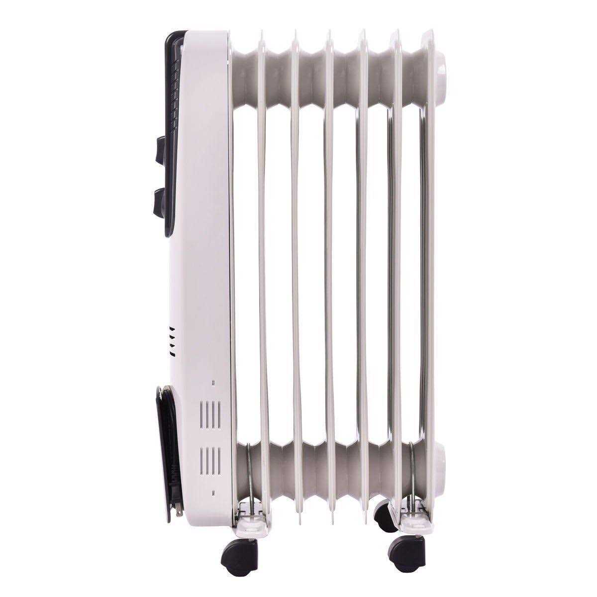 Effectively and quickly heat any room of the house with the timer oil-filled radiator. Want immediate relief from the cold in the shortest time possible? This heater’s unique design allows heated air to rise faster and gain high speed, producing hotter air than a standard oil-filled radiator. The user-friendly control panel offers an adjustable thermostat and three heat settings to customize your heating needs and optimize energy-efficient operation. A gently rounded design, and a thermal cut-off function that automatically turns the heater off if it starts to overheat. With its sleek look and silent operation, the oil-filled radiator is the perfect solution to all your heating needs Feature Customize your heating needs with the adjustable thermostat and three heat settings Banish the chills with an energy-efficient safe heat oil-filled radiator Quiet heater serves as an alternative heat source in small and medium rooms Three power settings allow flexibility for diverse rooms and personal heating needs Heater runs low at 600 watts, medium at 900 watts and 1500 watts maximum to slowly spread warmth Heater also automatically shuts off upon overheating Four wheels enable easy transportation from one room to another Power cord wraps around for storage The light will be turned on while the heating element is working. With Carrying handle Specification Heating Coverage: 215 sq.ft.