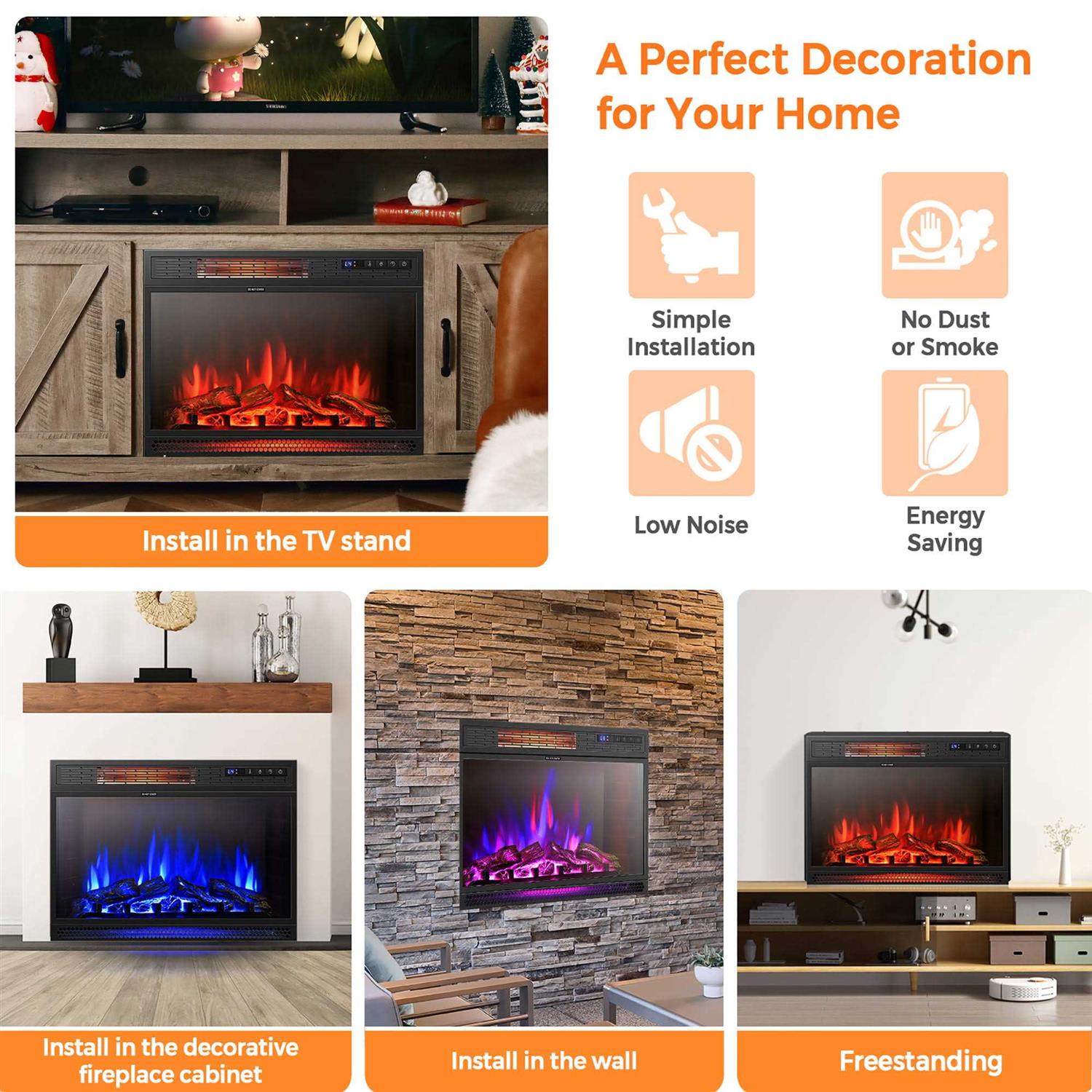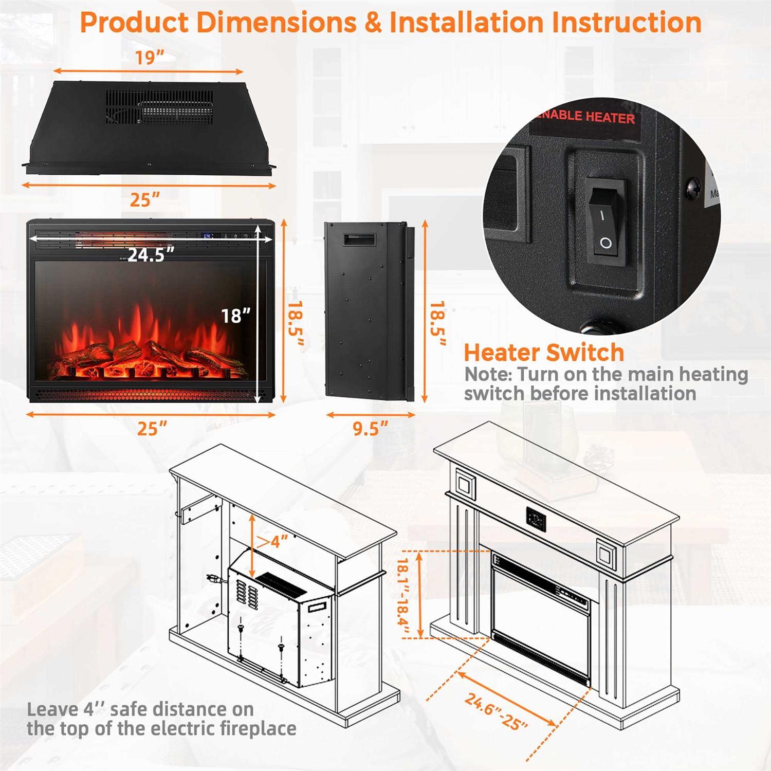 Experience warmth and ambiance with our 25-Inch Electric Freestanding & Recessed Fireplace, featuring an infrared heater that warms you in seconds without drying the air. Crafted from premium materials, this fireplace ensures long-lasting use. Choose between 900W/1350W heat settings and adjust the temperature from 62°F to 82°F for personalized comfort. Enjoy a realistic flame effect with 3 flame colors and 4 brightness levels. The overheat protection design prioritizes safety, while the touchscreen and remote control make operation a breeze. Set the timer from 0.5 to 6 hours to suit your preferences, and with a maximum heat of 5000 BTU, this fireplace can warm up to 400 square feet. Whether freestanding or insert installation, simplicity is guaranteed with clear instructions. Elevate your space with the perfect blend of warmth, style, and convenience.