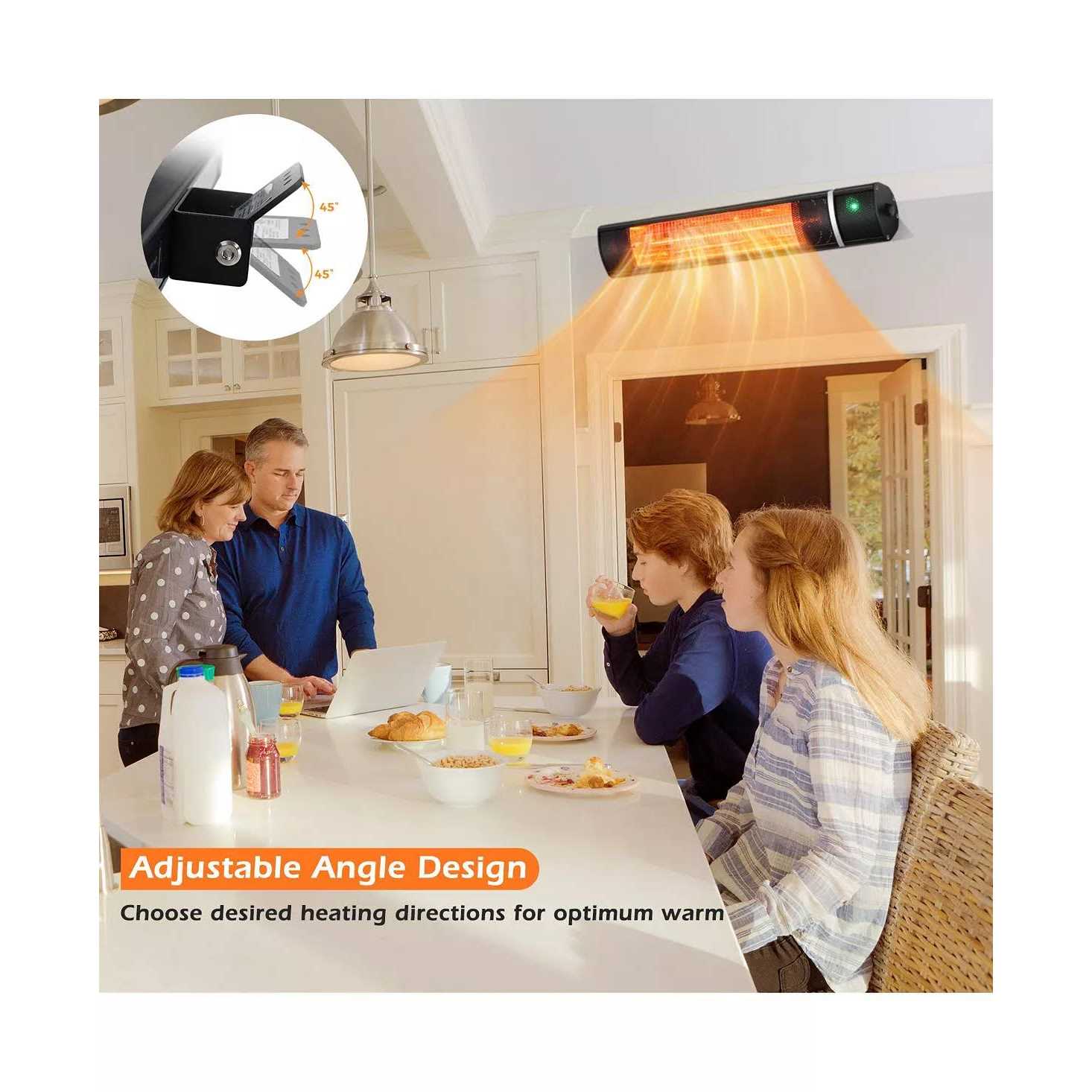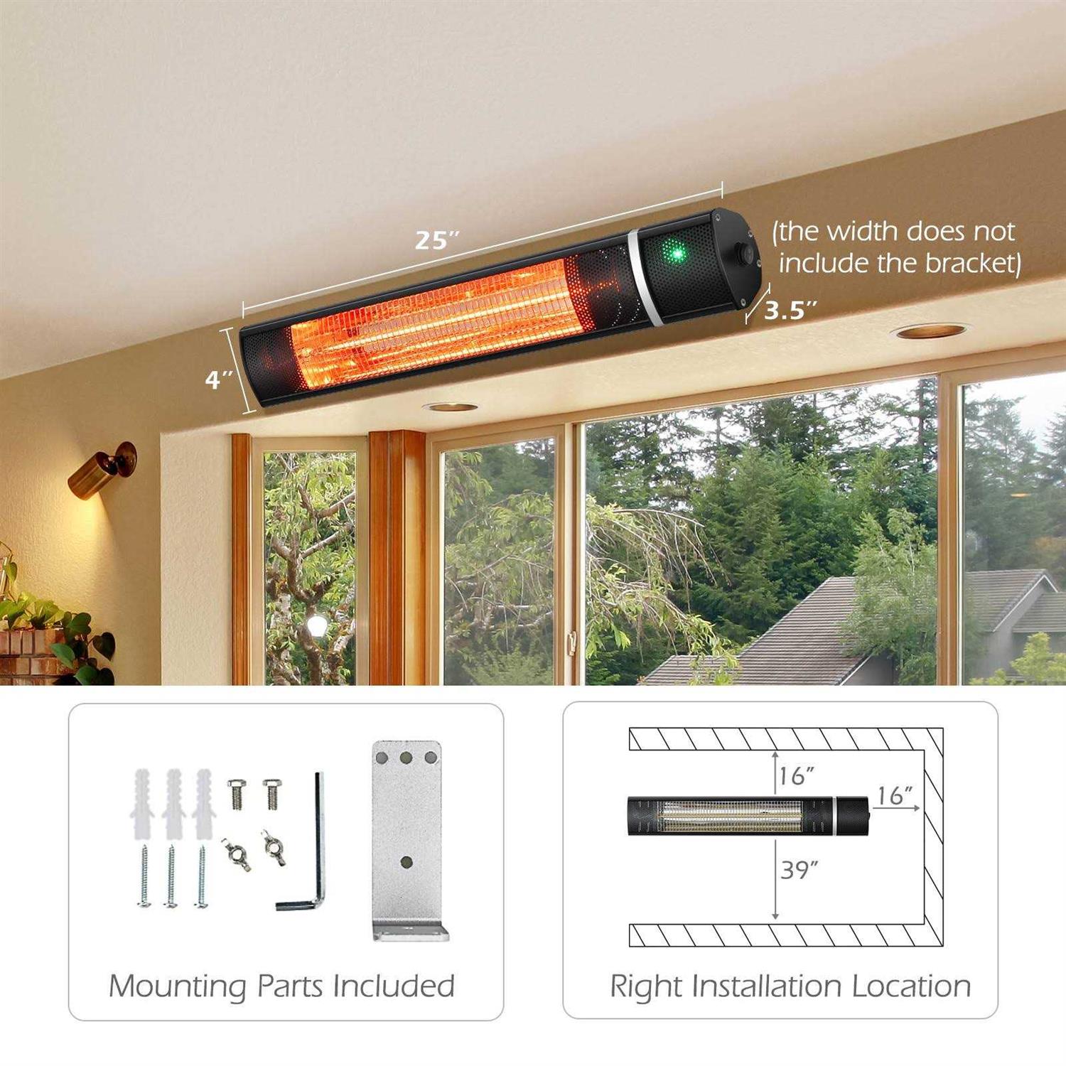 Adjustable heating modes (750W/1500W) & 9 heat range for ideal temperature 0-45 degree tilted mounting angle for better warm enjoyment 24h time setting with auto shut-off setting for cozy sleep Feature This wall mounted electric heater provides you a warm place in winter. With advanced infrared heating system, our space heater can heat up your room in 1 second. And the remote control allows you to set an ideal temperature easily. Besides, you can change the tilted angle of this heater to set a great radiation direction and its quiet operation offers you a better environment for relax and work. 24h timer with auto shut-off can save your bill effectively. Whats more, high quality heater with wall-mounted design ensures the safe using experience and much more useful space. Specification Material: Aluminum Alloy Overall Dimension: 21 x 4 x 4 (LXWXH) Net Weight: 3.5 lbs Maximum Energy Power: 1500W Rated Voltage: AC120V, 60Hz Power Cord Length: 6.2 Package Includes: 1 x Infrared Space Heater, 1 x User Manual, 1 x Screw Bag