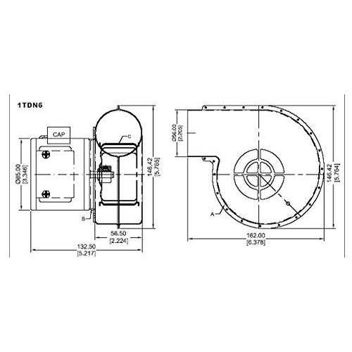 Technical Specs Dayton 1TDN6 Item OEM Blower Blower Outlet Shape Round With Flange No Blower Wheel Diameter 3″ Blower Wheel Width 1-7/8″ Blower Item OEM Specialty Blower Blower Voltage 115VAC Blower Motor Type Permanent Split Capacitor Blower Thermal Protection Auto Blower Conduit Box Yes CFM @ 0.000-In. SP 51 CFM @ 0.100-In. SP 48 CFM @ 0.200-In. SP 43 CFM @ 0.300-In. SP 39 CFM @ 0.400-In. SP 34 CFM @ 0.500-In. SP 23 Hz 50/60 Phase 1 Full Load Amps 0.23 RPM 3105 Bearing Type Ball Motor Enclosure Open Motor Insulation Class B Lead Length 13″ Max. Ambient Temp. 104 Degrees F Max. Inlet Temp. 104 Degrees F Inlet Dia. 2-3/8″ Outlet Dia. 2-1/8″ Overall Height 5-13/16″ Overall Width 5″ Overall Depth 6-7/16″ Wheel Type Forward Curve Drive Type Direct Mounting Position All Position Housing Finish Enamel Housing Material Rolled Steel Housing Color Gray Agency Compliance UL Recognized US and Canada (E47479), CE Replaces 4C441