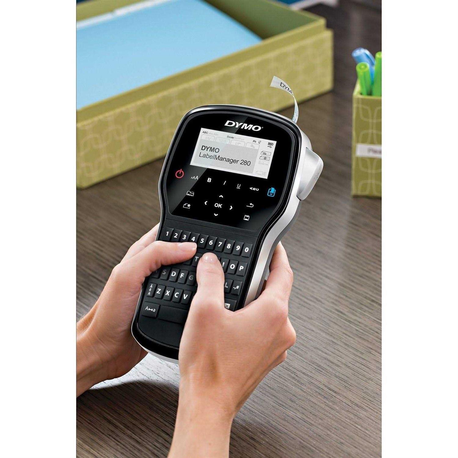 Dymo 1815990 LabelManager 280P delivers labels faster with time-saving features. Customize labels with any fonts and graphics on your computer through PC or Mac connection. Type text quickly on the computer-style (QWERTY) keyboard with country-specific layout. Avoid the cost and waste of disposable batteries with the included rechargeable battery pack. Edit text easily with one-touch fast-formatting keys. Label printer prints fast and uses Dymo D1 labels in 1/4″, 3/8″ and 1/2″ widths. Display size is 14 characters x 2 lines. Maximum print height is 22.7 point. LabelManager 280P also features a manual tape cutter, three fronts, six type sizes, seven styles, 221 symbols, repeat printing, auto numbering, and mirror/vertical printing. Label printer includes a charging cable, and black/white starter D1 cassette.