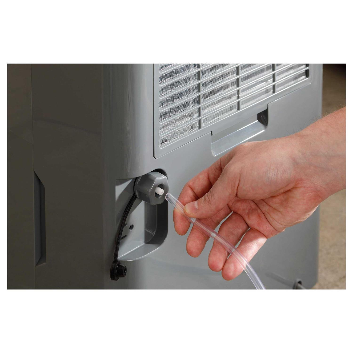GE Appliances Energy Star dehumidifiers are designed to effectively remove excessive moisture for various dampness levels, offering optimal home comfort for you and your family. The GE 50 pint Energy Star Dehumidifier with built-in pump removes up to 50 pints of water from the air every 24 hours. This model is ideal for wet room conditions, anywhere in the home, basement, garage, or high humidity areas. The built-in pump with an included hose, allows water to be drained to any convenient location up to 16 feet away. This feature eliminates the need to check in on the water level in the bucket, so you don’t have to empty the bucket periodically. Smart Dry mode compares the set humidity with the room’s actual humidity and automatically adjusts the fan speed accordingly. The soft touch control panel and LED digital controls on this GE dehumidifier let you clearly see and manage your settings. The Energy Star model offers 2 fan speeds to choose from, auto defrost control, and a 2 or 4-hour off timer, while pocket handles and easy roll hidden wheels make it easy to move from one location to another.