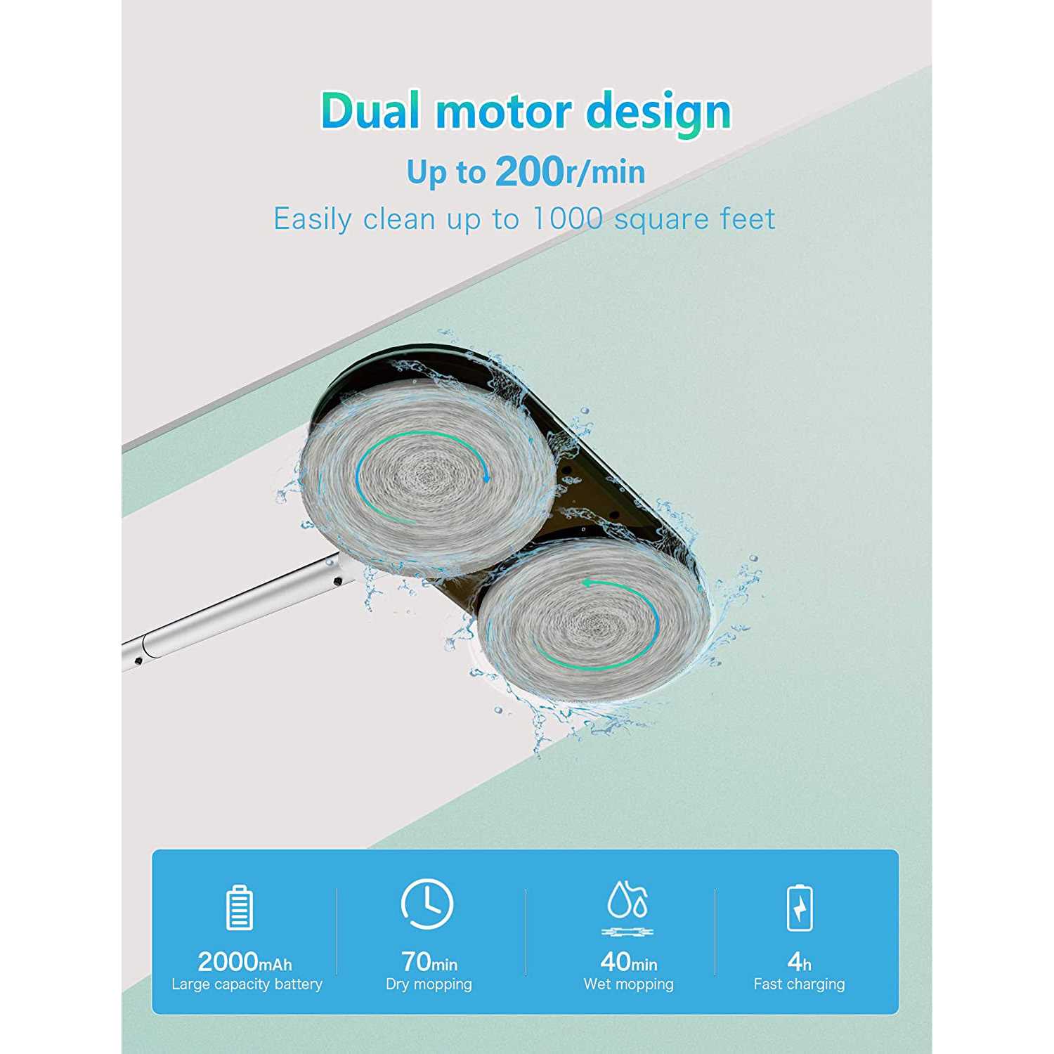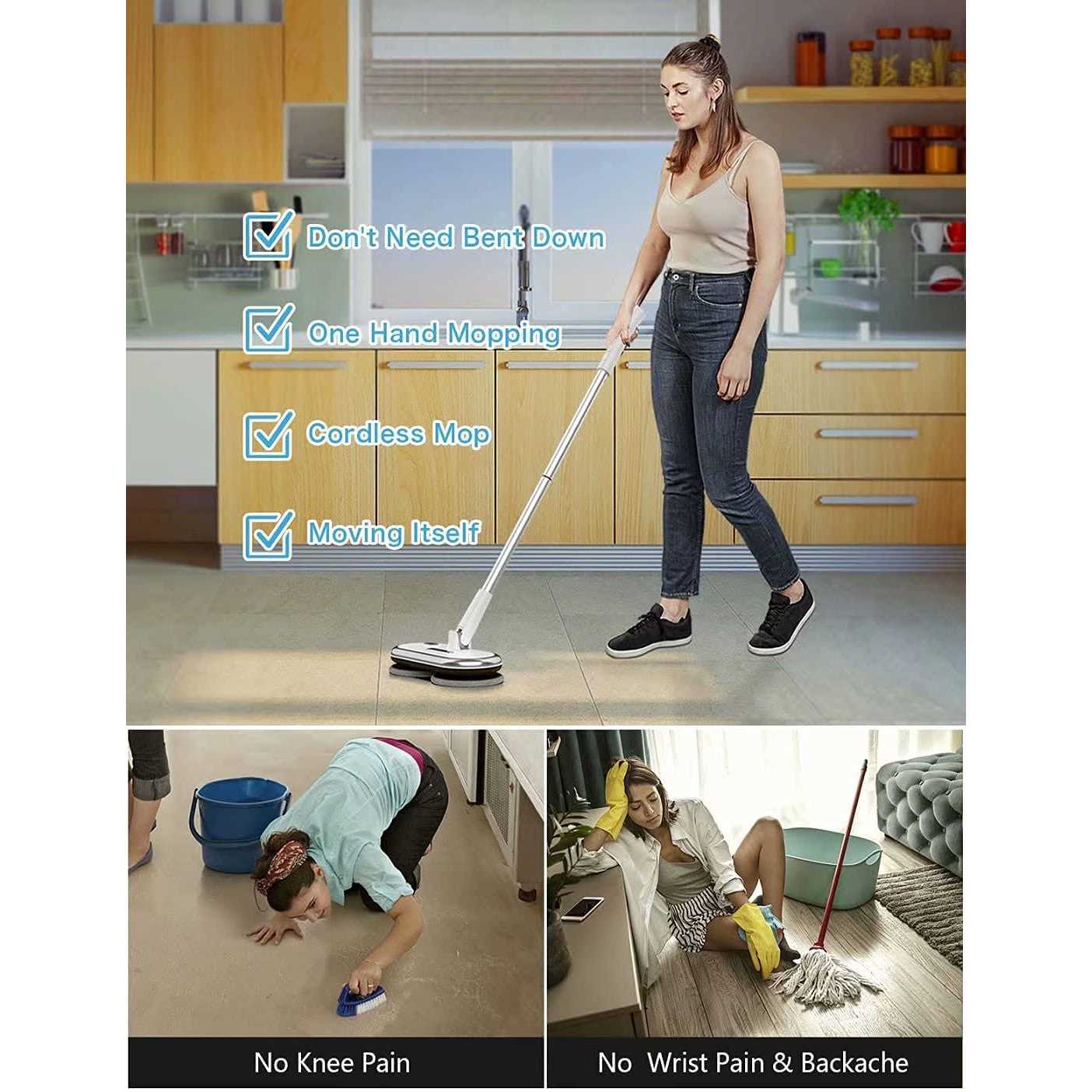 Mopping without Stoop – Electric mop speed up to 200r/min use dual motor design, which exceeds the average value of similar products.it can move forward by itself, you don’t have to bend over to wipe the floor when you wipping floor. – Mother love it – Electric Mop is 3.3LB weight and can be used by anyone. Old age or back pain is making traditional mop use more difficult. This mop does a super light and easy to move about. Flexible mop head can removes the grime from those hard to reach places! You just need to control the way forward,It can do hard work for you mother. – Multifuntion Tool – You can use on any surface you want to clean: hardwood floors, vinyl, tiles, marble, window,glass door,stairs. – It can effective in cleaning up the spills, dust, quickly and makes the area clean and tidy. – Easy Installtiion – The mop rod can be combined with the mop head to form two lengths (21 / 47 inches). It only takes you ten seconds to remove or combine the mop rod. – The built-in battery can be used for at least 40 minutes when fully charged. – Great mop pad – You’ll receive 4 microfiber floor mop pads, 2 scrubber pads, for every cleaning need in your home! microfiber pads for better absorption when wet mopping and better dust dirt-trapping when dry. Scouring pads remove the stickiest and toughest messes! Product Description Multifunctional cleaning tools. Eletric mop could help you reach any corners and any heights in your house. Window Cleaner Only a rod and mop link can easily clean the French window, with the use of detergent can quickly remove the dust and grease on the window. Wall Cleaner mop The 44in pole lets you clean high or low without a ladder or bending over,easy remove dust, grime, cobwebs, allergens Detachable mop rod According to the actual working situation, the mop head can be combined with one or two rods freely. Of course, you can also use the mop head directly. The length of each combination is indicated in the figure. Mop pads material and noise Microfiber Mop pads Extra thick microfiber pads for better absorption when wet mopping and better dust dirt trapping when dry. great for dusting vinyl, hard-wood, tile, laminate,and pick up hair! Scouring Pads Sturdy abrasive scour pads scrub off stuck-on food, grease, grime from floor fast and effectively, help you to keep your kitchen shiny and neat after every use.it isn’t easy to tear and wear out even after numerous uses. Low noise The self-developed transmission mechanism produces only 50 d – B of noise during use.