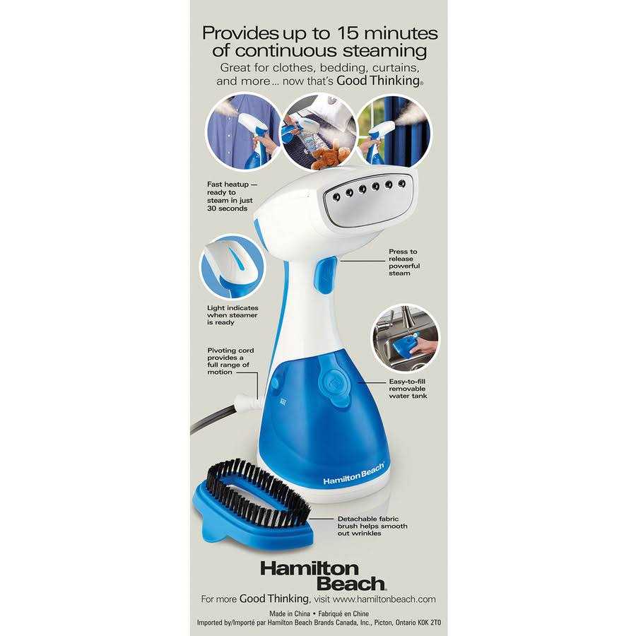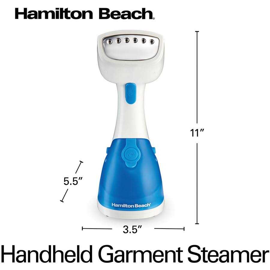 The Hamilton Beach Handheld Garment Steamer provides 15-minutes of continuous steam, great for relaxing wrinkles and refreshing clothes, bedding, curtains and the like. Fast heat up, a detachable fabric brush and pivoting cord speed up and simplify the steaming process. 15-Minutes of Steam Powerful 1000-watt steam pump produces 15-minutes of continuous steam before needing a refill. Great for smoothing clothes while they’re still on the hanger, refreshing upholstery and saving on trips to the dry cleaner. Easy to Fill The water tank removes for easy filling in the sink. Ready to Steam in Just 30-Seconds Fast heat up is convenient when you need to quickly steam an outfit in the morning. A soft blue light indicates when the steamer is ready to go. Fabric Brush Included A detachable brush helps steam penetrate the fabric’s fibers for the most effective cleaning and de-wrinkling. Pivoting Cord A pivoting cord provides a full range of motion.