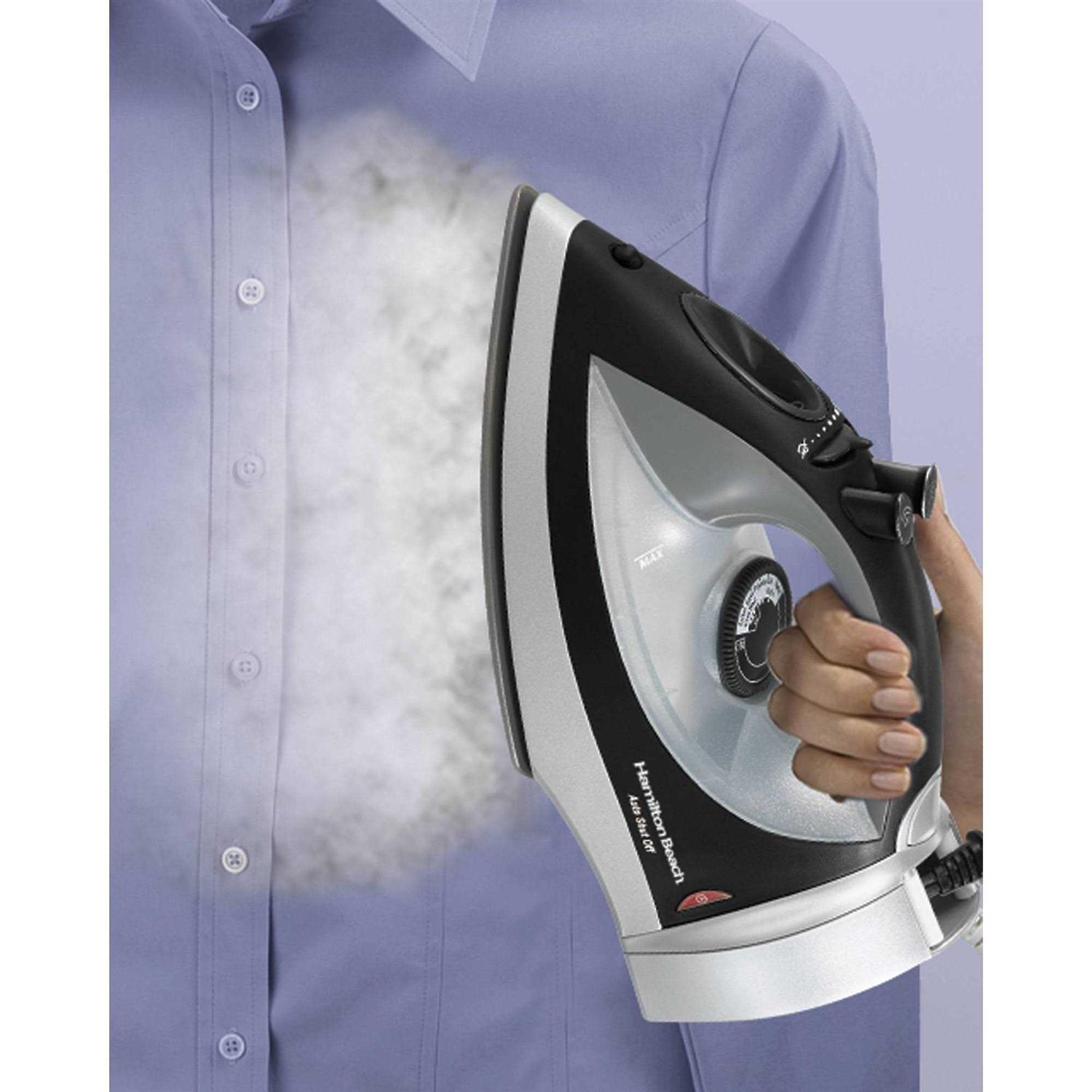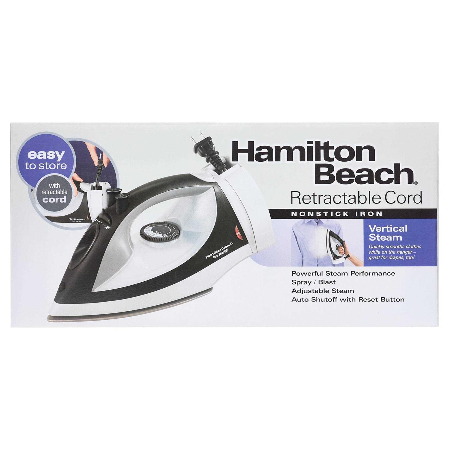 Easy-to-use heat-setting dial. Smooth-gliding, non-stick soleplate. Adjustable steam system. Vertical steam option. 1200W of power. Push-button retractable cord. Auto shutoff with reset button. Smooth gliding and powerful, the Hamilton Beach 14210 Retractable Cord Iron smooth wrinkles without damaging fabrics. This powerful 1200-watt iron provides superior steam performance with adjustable settings and a vertical mode for hanging garments and curtains. The cord retracts for easy storage with the push of a button, and the auto shutoff also includes a reset button for safety.