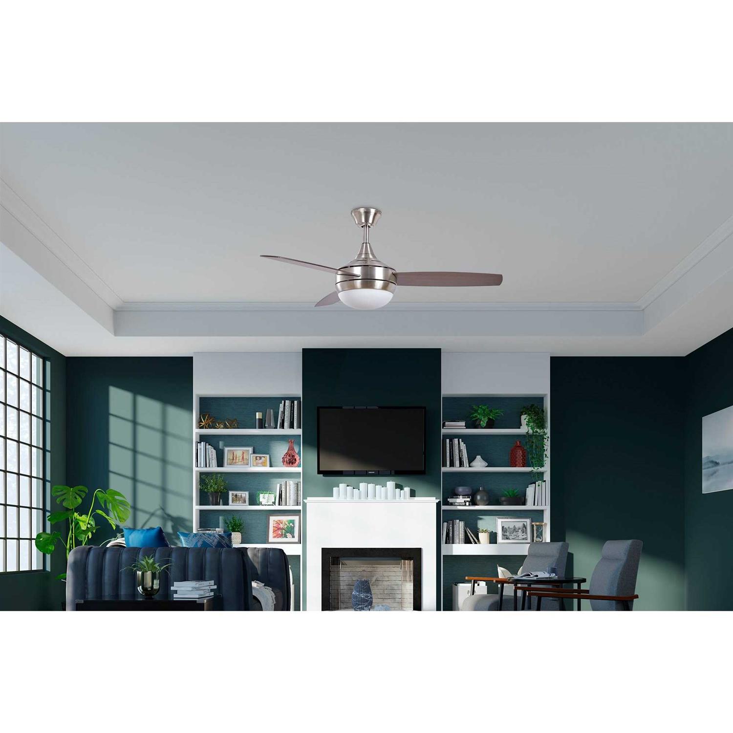 Brushed nickel finish ceiling fan from the Beach Creek collection features 3 reversible blades in a dark oakwalnut finish. Integrated LED frosted glass light kit offers bright energy-efficient illumination. 44-in fan with 10. 5 blade pitch provides airflow up to 3964-CFM making it ideal for small rooms up to 100-sq ft. 3 speed settings make it easy to maintain your ideal comfort level. Remote control included so you can operate the fan and light from anywhere in the room. Reverse air flow feature allows you to change the direction of the fan according to the season. 6-in L downrod included for highervaulted ceilings or install without the downrod as a close mount for lowerstandard ceilings. Great for contemporary style decor.