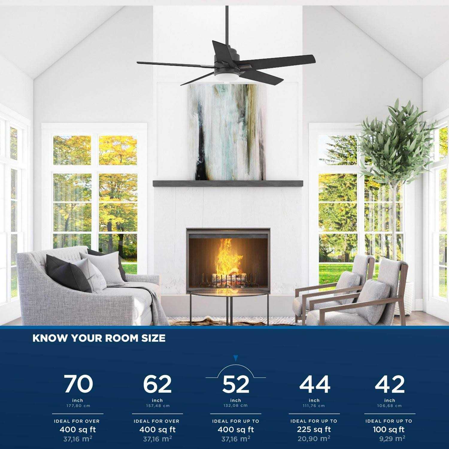 Custom White Spectrum technology features light color ranging from a warm white light to a bright white light. Adjust light between activities or by time of day- wake up with natural light, focus with bright white and wind down with a warm glow. Easily control the 3 speed settings, light output and color using the handheld/wall-mount remote included with the ceiling fan. Frosted glass houses integrated LED board with Custom White Spectrum technology featuring light color ranging from a warm white light (2200K), like a candlelight glow, to a bright white light, simulating daylight (6500K). With a blade span of 52 inches and airflow up to 4602 CFM, this fan is perfect for medium to large sized rooms. This fan can be hung indoors from standard or angled ceilings using the 4-in downrod that’s included. Matte black finish ceiling fan from the Flanagan collection features 5 reversible black/driftwood blades so you can choose the right look for your home. Quiet, reversible motor efficiently circulates cool air in the summer and warm air in the winter, cutting down on energy costs.