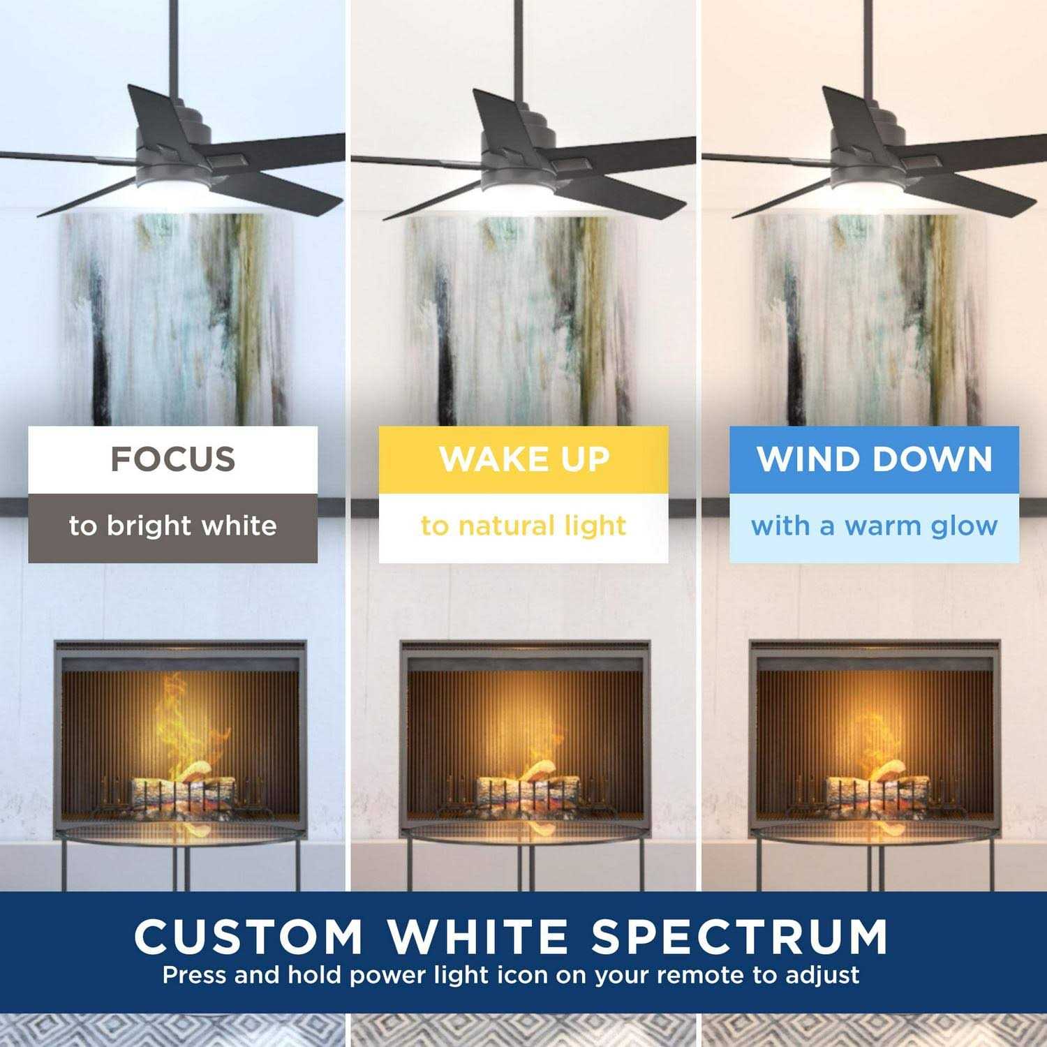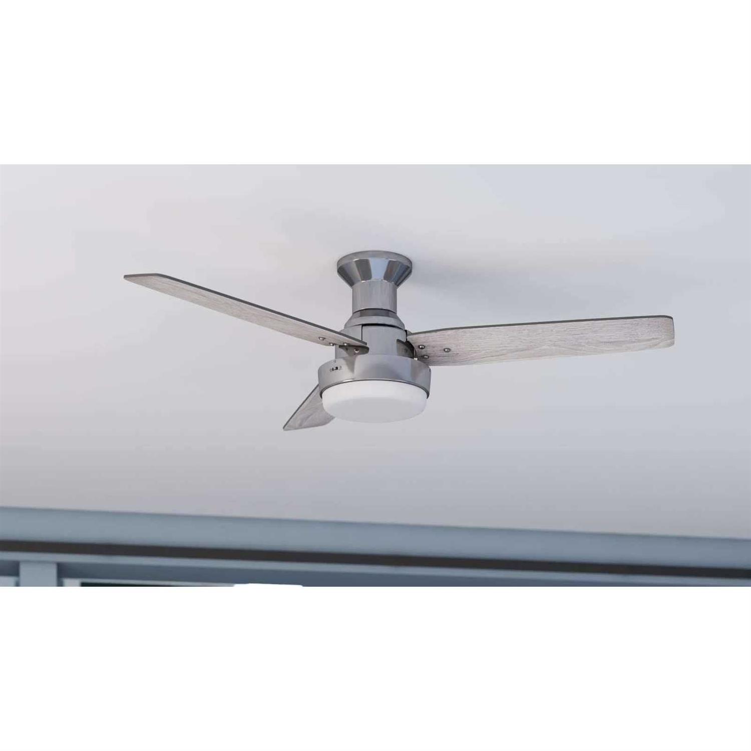 Custom White Spectrum technology features light color ranging from a warm white light to a bright white light. Adjust light between activities or by time of day- wake up with natural light, focus with bright white and wind down with a warm glow. Easily control the 3 speed settings, light output and color using the handheld remote included with the ceiling fan. Frosted glass houses integrated LED board with Custom White Spectrum technology featuring light color ranging from a warm white light (2200K), like a candlelight glow, to a bright white light, simulating daylight (6500K). With a blade span of 52 inches and airflow up to 4626 CFM, this indoor fan is perfect for medium to large sized rooms. Low profile design to be mounted flush with the ceiling where more walk-through space is required. Brushed nickel finish ceiling fan from the Mac collection features 3 reversible driftwood/toffee blades so you can choose the right look for your home. Quiet, reversible motor efficiently circulates cool air in the summer and warm air in the winter, cutting down on energy costs.