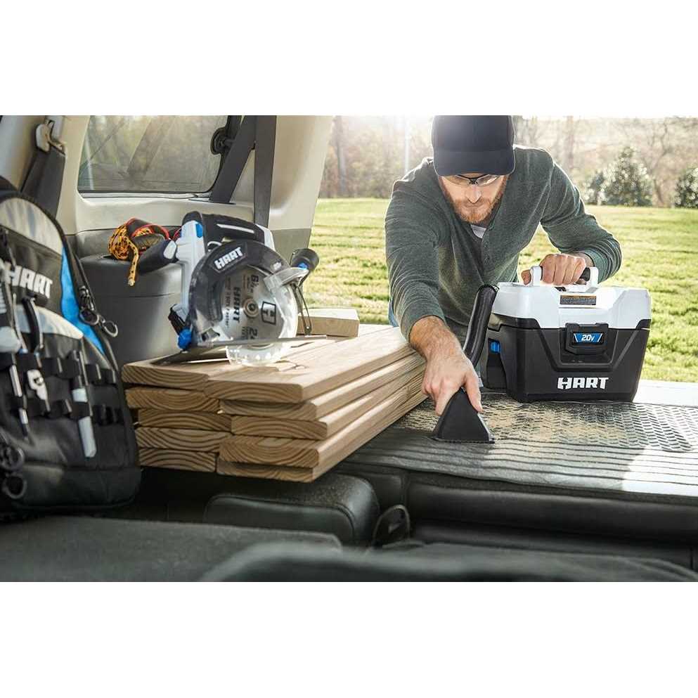 HARTs 20v 2 Gallon Wet/Dry Vac is the perfect tool for portable cleaning in large durations with its holding capacity. Also, this tool comes with an ultra flexible 6 x 1-1/4 hose, utility nozzle and crevice tool that adds versatility to get to certain spots while cleaning. Another feature that increases versatility is the pivoting air inlet. To keep all accessories together there is on-board storage for convenient access. Includes (1) 2 Gallon Wet/Dry Vac, 6 x 1-1/4 flexible hose, utility nozzle, crevice tool and pleated paper filter. The HART 20v 2 Gallon Wet/Dry Vac operates on any HART 20V Lithium-ion battery to provide you with long-lasting, fade-free power to help you power through any mess and allow you to continue to build your collection of power tools.