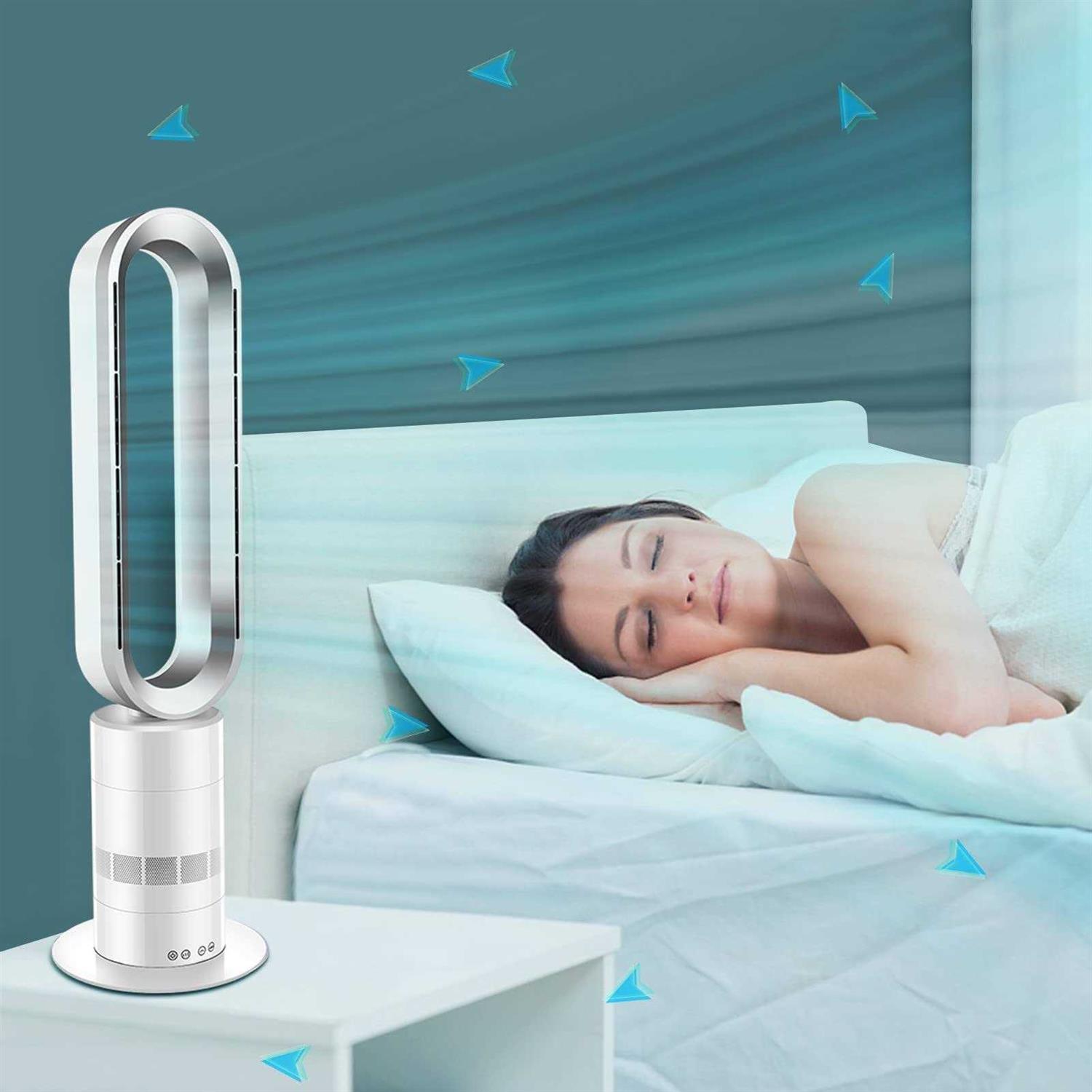【Blade-less Design】Fan and Heater Combination – Adopting safer and more reliable blade-less design style, fashionable and classic, with two modes of hot air and cold air, which can meet the different needs of winter and summer seasons, and can be used all year round. 【Intelligent Remote Control】Remote intelligent one piece control, when you are in the sofa leisure or office can be operated remotely to save time, or you can also choose to manually mobilize, because he has both manual operation and intelligent operation mode. 【Low Noise Energy Saving】When running, the bass is smooth, reducing turbulence and turbulence, airflow transmission is smooth, using DC brushless motor and U-shape shunt technology, which plays a double noise reduction effect, helping you to improve the quality of your sleep, in addition, there is a PTC ceramic heater, which doubles the heat, and the fast start-up only takes 1 second, increasing the airflow output under the same energy consumption. 【Surrounding air supply】Room 360 degrees without dead angle surround air supply, air convection circulation, will not consume the moisture in the air, comfortable and not dry, whether it is winter heating or summer cooling, can achieve the best results. Stylish and elegant design concept, safe and more energy-saving bladeless fan and heater a combination of winter and summer can be used, noise reduction function, 3 warm air modes and 10 cold air modes, 9H timer function, 120-degree wide-angle oscillating head.