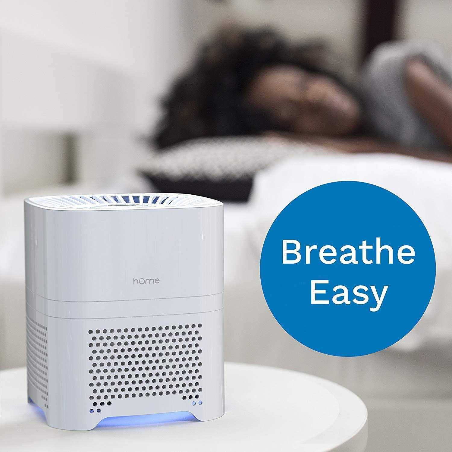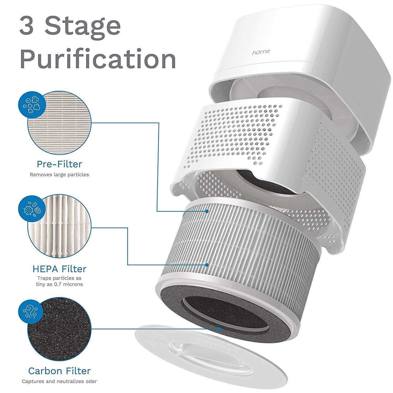 Our hOmeLabs personal air purifier has a filter with 99.97% efficiency rating that quietly purifies and ionizes indoor air to reduce odors and particles. Our rigorous, 4-stage filtering process includes a pre-filter to capture large particles, a HEPA filter with an ion booster to catch additional air adulterants and help you breathe more easily Bye-bye bad smells! This air purifieru2019s ionizer helps to eliminate unwanted odors from sources like pets and smoking. Then releases negative ions to thoroughly purify the surrounding air. Measures 6.7 x 6.7 x 7.5 inches for travel size, with up to 40 sq-feet coverage. Has customizable fan settings that allow you to choose the quieter, sleep-friendly u201clowu201d power, or max-freshness u201chighu201d power. With indicator light to tell when itu2019s time to change the filter. With clear instructions on how to use, just plug it in and it works with one simple button. If you need any assistance, you can reach our team of experts via chat, email or phone.