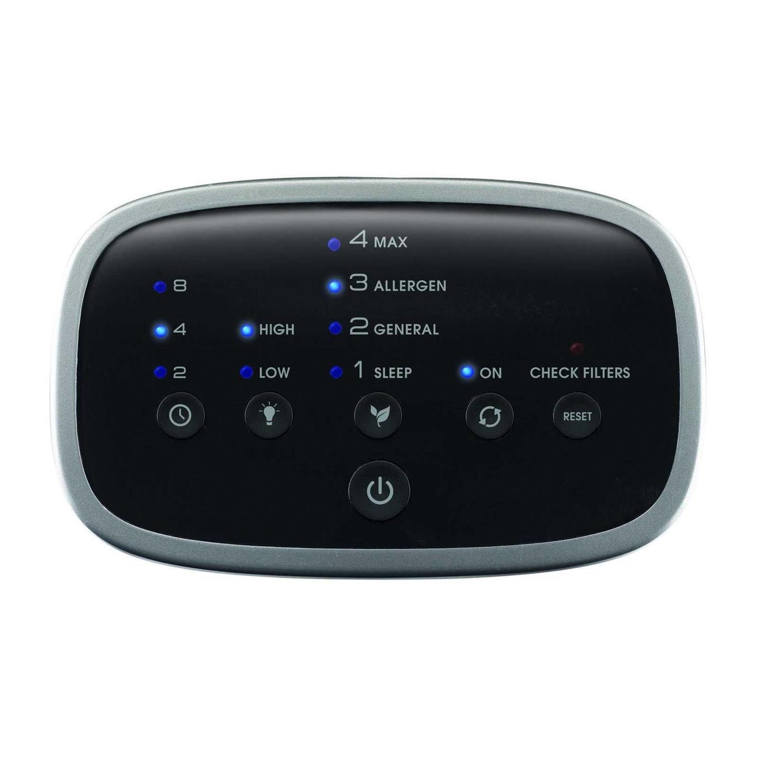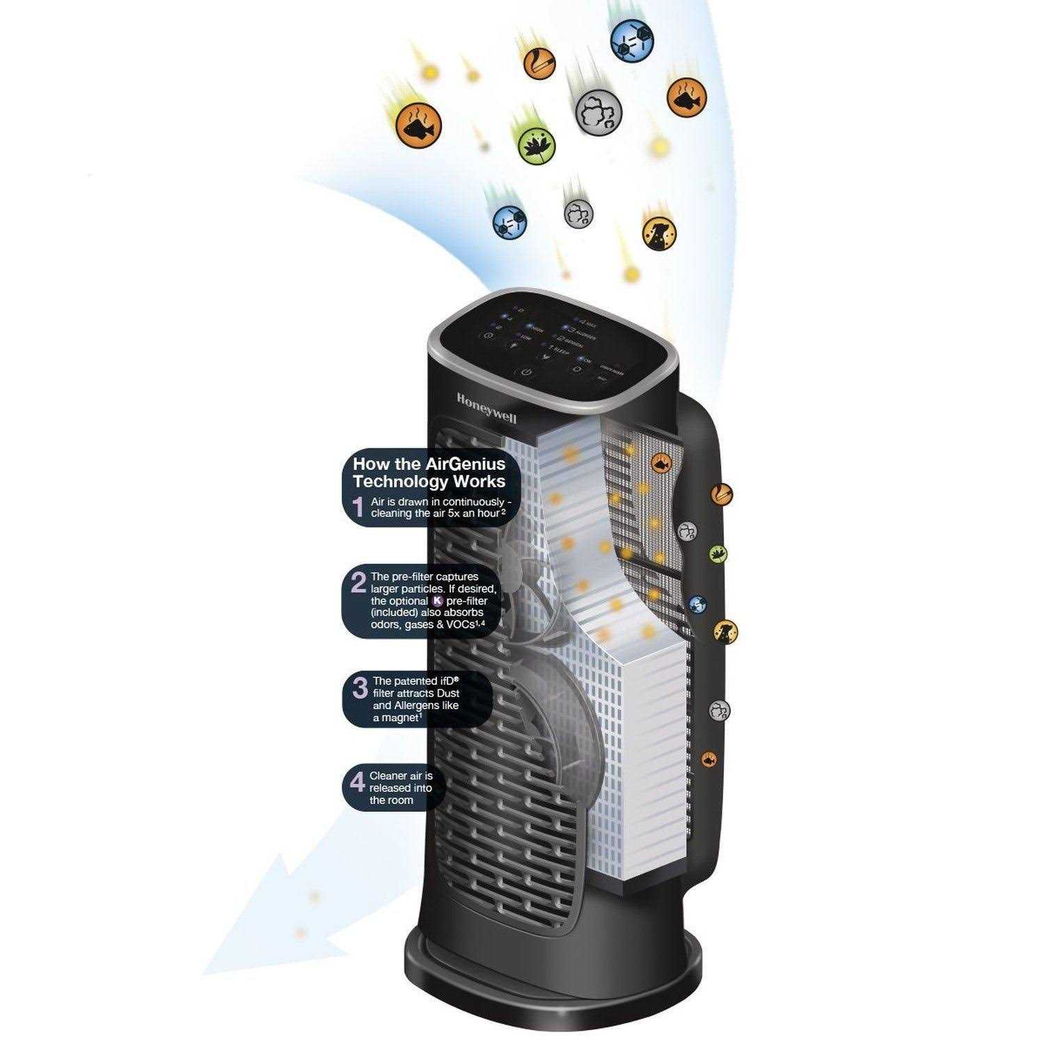 Honeywell AirGenius 4 Air Purifier Compact air cleaner/odor reducer. Four cleaning levels, 2, 4 or 8 hour timer. Oscillation and allergen intelligence setting. Includes 2 prefilters, washable or odor and gas reducing. Freshens air by absorbing odors. Air Cleaner Machine Type: IFD; CADR: 84 (pollen); 95 (dust); 98 (smoke); Maximum Room Size (Square Footage): 150 sq ft; Maximum Room Size: 15 ft x 15 ft. Total Recycled Content Percent: 0% Post-Consumer Recycled Content Percent: 0% Pre-Consumer Recycled Content Percent: 0% Compliance Standards: ETL Length: 7 1/4″ Height: 18 8/9″ Depth: 10.55″ Width: 8.26″ Fan Settings: 4 Replacement Filter: HFD28X Speeds: 4 Color(s): Black Filter Types: 99.9% of Microscopic Airborne Particle Maximum Room Size: 15 ft x 15 ft Maximum Room Size (Square Footage): 150 sq ft CADR: 84 (pollen); 95 (dust); 98 (smoke).