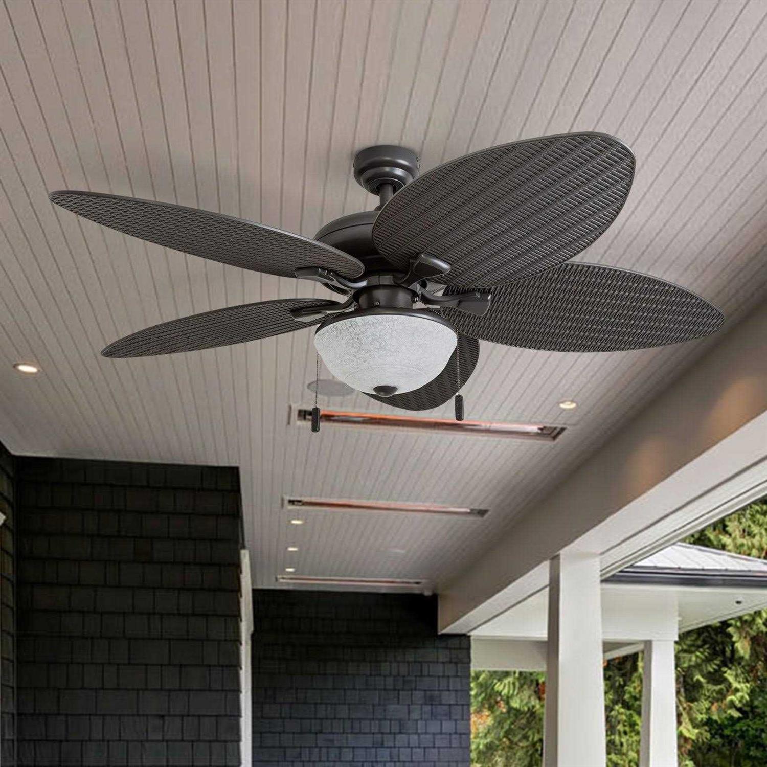 There’s no greater place to be than in the comfort of your own home. Whether it’s indoors or outside the Honeywell Inland Breeze Ceiling Fan is the perfect companion. The enclosed bowl light and damp-rated housing ensure your readiness for outdoor weather while the stylistic wicker and rich bronze finish will have you prepared for any scenario. The white scavo glass brings a very crisp and wholesome allure making this fan ready for your home. The blades come with two designs one on each side. The first side holds the traditional wicker pattern while the other houses a tropical palm leaf. Overall the Inland Breeze 52-inch tropical Outdoor Ceiling Fan is sure to liven up any area including your front patio while leaving each of your guests in awe.