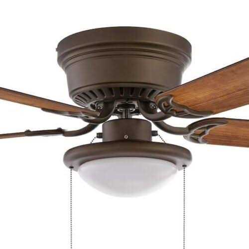 Use this low-profile Hugger 44 in. LED Oil Rubbed Bronze ceiling fan for flush-mount installations when ceiling height is of concern. Featuring reversible molasses maple/applewood blade finishes. The opal frosted dome light fixture includes a 9-Watt LED bulb that provides bright illumination. With a high-performance motor for powerful, yet quiet operation.5 reversible molasses maple/applewood blades – Dome style light kit with opal frosted glass3-speed with reverse control – Space-saving design is ideal for small rooms – Designed for indoor use only – Small room: 10 ft. x 10 ft. or smaller – Uses one 9-Watt medium base LED bulb, included – Flush mount application for low ceilings153 mm x 10 mm motor offers superior air movement.