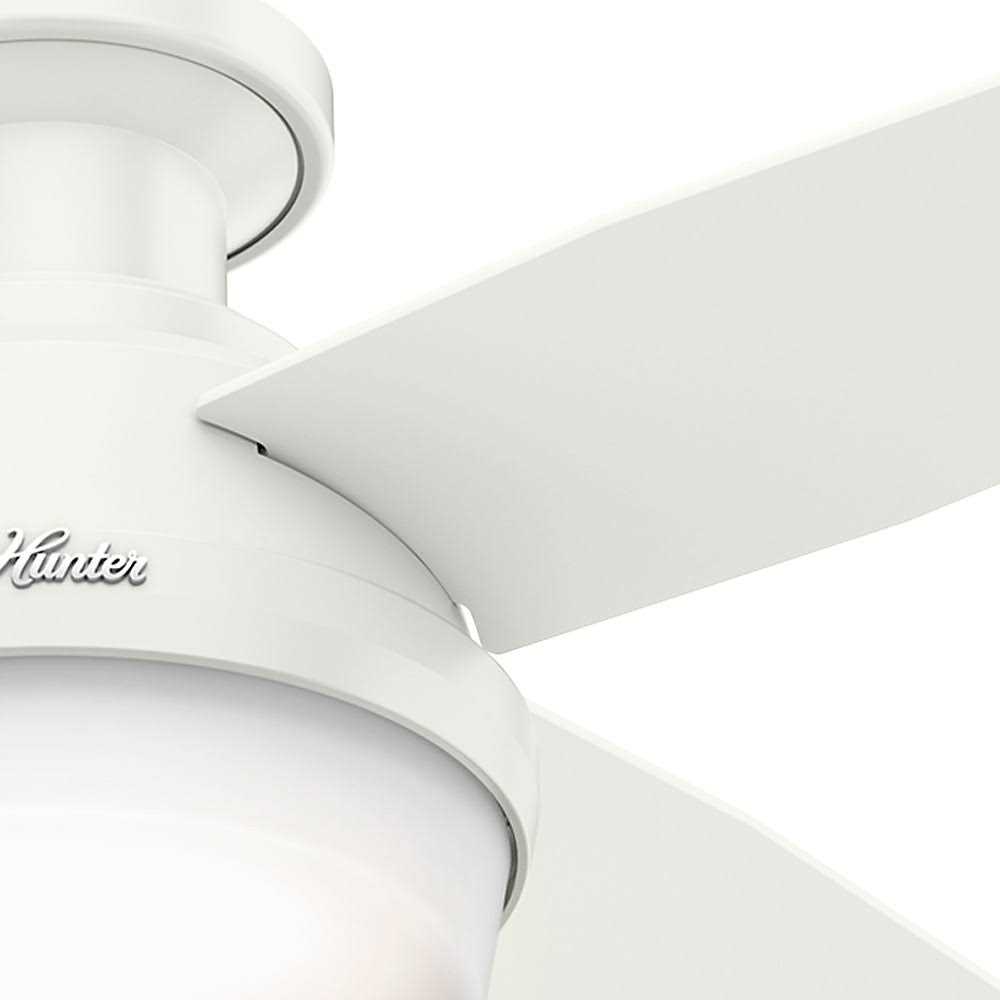 Hunter Dempsey 44 LED Low Profile 44″ Indoor Ceiling Fan: 4 reversible blades; Hunter combines 19th century craftsmanship with 21st century design and technology to create ceiling fans of unmatched quality, style, and whisper-quiet performance. Using the finest materials to create stylish designs, Hunter ceiling fans work beautifully in today’s homes and can save up to 47% on cooling costs! Included components: 4 reversible fan blades. Drum light kit with (2) 10W LED’s. Canopy and mounting hardware. Product technologies: whisper wind motor, available on most Hunter Fan models, delivers ultra-powerful air movement with whisper-quiet performance. Wind to produce the cooling power you want without the noise you don’t. Special features: brushed nickel finish features reversible black Oak and chocolate Oak blades. Fresh white finish features reversible fresh white and blonde Oak blades. 3 speed reversible AC motor. Fan specifications: blade span: 44″. Number of bulbs: 2. Bulb type: LED. Watts per bulb: 10. Bulbs included: yes.
