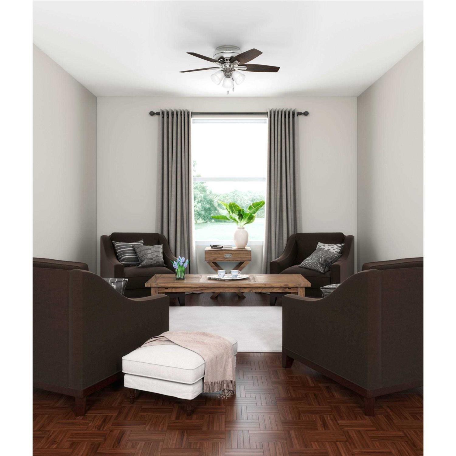 Features: WhisperWind motor delivers ultra-powerful air movement with whisper-quiet performance so you get the cooling power you want without the noise you dont. Reversible motor allows you to change the direction of your fan from downdraft mode during the summer to updraft mode during the winter. 5 Fresh White / Light Oak Reversible blades included. 12 degree blade pitch optimized to ensure ideal air movement and peak performance. 3 Speeds. For indoor use only. Low Profile housing is specially designed to fit flush to the ceiling and is ideal for use in rooms with low ceilings. Included pull chain allows for quick and easy on/off and speed adjustments.