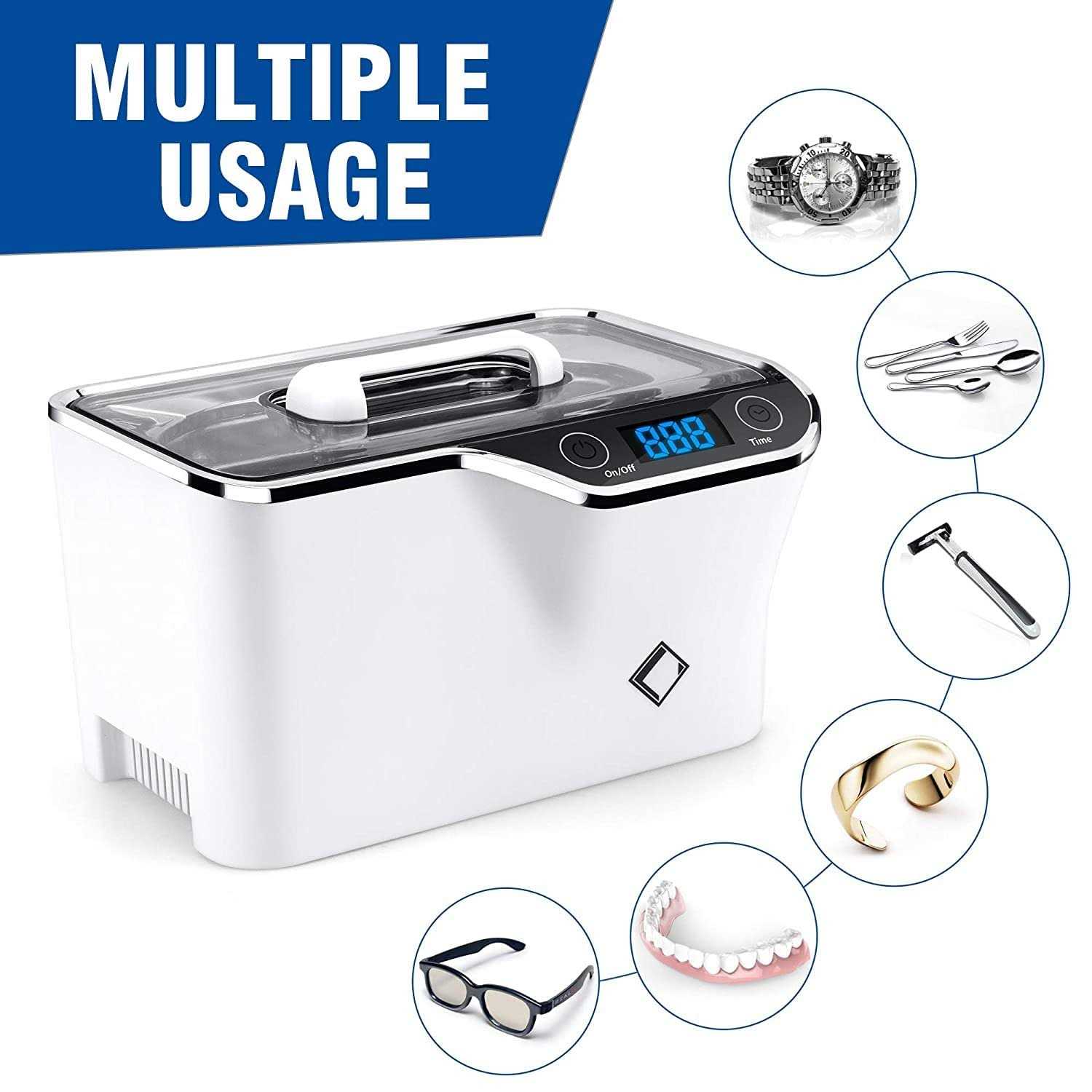 New design: CDS-100 ultrasonic cleaner has more powerful and effective ultrasonic wave (42000Hz) than others (40000Hz), ensures more powerful cleaning results. Touch button: service life is twice longer than mechanical ones. Long lasting working time: mute fans extend working time without affecting the cleaning effect. Practical: removable power cord, it is easy to replace water. 600 ml stainless steel tank, basket and watch stand included. (Note: 1. Please put water into the sink before turning on the machine, otherwise the machine may be damaged. 2. If the lenses have very small scratches, you should not use them for cleaning.) Newly developed ultrasonic cleaning device – The only touchscreen ultrasonic device on the market. PRINCIPLES Works by generating sound waves emitted into the tank and cleaning solution. These waves produce millions of microscopic bubbles that break or implode, releasing large amounts of energy and cleaning the surface. Areas of use: Jewelry stores: restore the shine and then the device removes dirt or harsh powder from unfinished items Opticians and laboratories: removes dirt between the rim and the lenses Home: children’s items; glasses, watch bands, razors, e-cigarettes and others Shooting clubs: use brass cartridges again Watch stores: precise parts cleaning Print businesses: free blocked printheads or ink cartridges Automotive stores: cleaning precision parts such as valves, injectors, equipment, and ball bearings Technical data: Tank material: SUS304 stainless steel. Case material: ABS Digital time settings: 180s-300s-480s-600s-90s Tank capacity: 600 ml / max. 500 ml. Ultrasonic frequency: 42 KHz. Power supply: 50 W (AC 220 – 240 V, 50/60 Hz). Product size: 20.4 x 14 x 13 cm. Tank size: 16.1 x 8.5 x 5.0 cm. Net weight: 0.98 kg. Gross weight: 1.23 kg. Box contents: 1 x ultrasonic cleaner. 1 x watch stand. 1 x operating instructions (digital German instruction manual sent by email). 1 x VDE power cable. 1 x BS power cable.