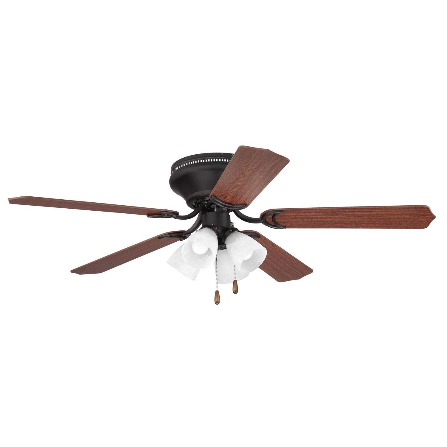 Ellington Fans BRC525C Brilliante 52″ 5 Blade Indoor Hugger Ceiling Fan – Blades Included Components:(5) Blades(4) Incandescent Candelabra (E12) Bulbs – Light Diffusing Shades – Light Kit – Features:Dry Location rated15 Year Warranty – Pull Chain Control means you’ll always know where the fan control is – Blade Specifications:Blade Span: 52″Number of Blades: 5Blade Pitch: 11°Blades Included: Yes – Blades Reversible: Yes – Motor Specifications:Amperage: 2Motor Type: AC Induction – Reversible Motor: Yes – Voltage: 120 VNumber of Speeds: 3Sloped Ceiling Specifications:For ceilings with slope from 35° to 45°, use the 45AD angled ceiling adapter – High or Low Ceiling Specifications:The BRC525C is designed for installation on standard 8 to 9 foot ceilings. If your ceiling is higher, you’ll need to purchase an additional downrod. The rule of thumb is that ceiling fans should have a minimum of 7 feet and a maximum of 9 feet of clearance between the bottom of the fan and the floor in order to circulate air efficiently. If you have a low ceiling, purchase the CMA flush mount adapter to reduce the hanging height of your fan. – Suggested Downrod Lengths:9 Foot Ceiling: 6″ – 12″10 Foot Ceiling: 12″ – 18″11 Foot Ceiling: 18″ – 24″12 Foot Ceiling: 24″ – 36″13 Foot Ceiling: 36″ – 48″14 Foot Ceiling: 48″ – 60″15 Foot Ceiling: 60″ – 72″For ceiling heights greater than 15 feet, you’ll need to purchase the downrod Coupler to join two downrods together. Indoor Ceiling Fans White