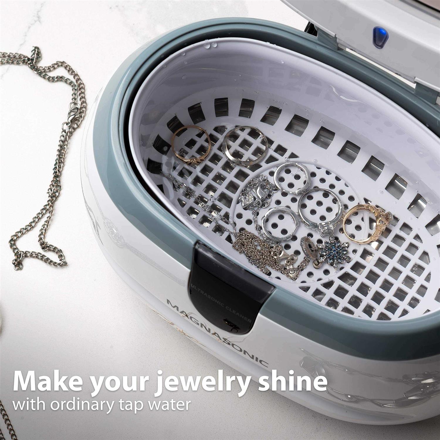 Bring Back the Sparkle and Shine Make your fine jewelry, eyeglasses, precious coins, and other household items sparkle like new with the Magnasonic Cleaner. Using ordinary tap water, this cleaner safely treats your jewelry and avoids the uncertainty of harsh chemicals and rigorous scrubbing while still leaving your items with an irresistible shine. Remove dirt, grime, rust, lime scale, fungus, and any residue from jewelry, small parts and hard-to-clean surfaces, and you can even clean items without taking them apart. With its transparent cover and illuminating light, watch first-hand the cleaning power of this cleaner as millions of microscopic cleansing bubbles clean in ways no hand or brush could match! Easy to Operate Restore your jewelry back to the day you fell in love with it. Simply fill the tank with water and get professional cleaning results in just 3 minutes. With 42,000 ultrasonic energy waves per second, the vibrations created by the device leave a sparkling shine on even the most stubborn jewelry. Quiet, Compact, and Built to Last With a generous 20 oz stainless steel tank (5.4 x 3.6 x 2.1 inches), this device will clean both your fine rings and large eyeglasses alike. Quiet, solid state circuitry and ease of operation make the cleaner an easy choice for anyone looking for a serious shine. Avoid Expensive Cleaning The high cost of professional cleaning prevents many people from getting their jewelry cleaned to remove accumulated oils and grease. Make a wedding ring shine for a highly personal anniversary gift. Using ultrasonic cavitation reduces the risk of damaging jewelry settings or losing a stone.