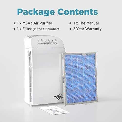 HEPA Air Purifiers by Membrane Solutions. Details:Membrane Solutions Air Purifier Membrane Solutions MSA3 Air Purifier delivers clean and healthy air for you and your family. MSA3 is a durable piece of equipment, with proper care, it will last for many years. Simple change the filters when exhausted. User-friendly Design: 1. Sleep Mode 2. Eight-hour sleep timer 3. Child Lock 4. Automatically stop running when the panel is opened. 5. Filter life display 6. Light Switch 8. Turbo Mode 9. Fan Speed: 3 positions 10. Quiet operation 25 – 47 dB 11. Energy-Saving: $12 to $15 per year.8 m2) – Noise Level: 25 – 47 dB – Dimensions: 13.1 x 7.7 x 21.5 In – Operational Weight: 13.7 Ib – Filters out 99.97% of particles as small as 0.3 microns and air pollution PM 2. Package Contents: 1 x MSA3 Air Purifier unit 1 x The operator manual 1 x Filter element (pre.
