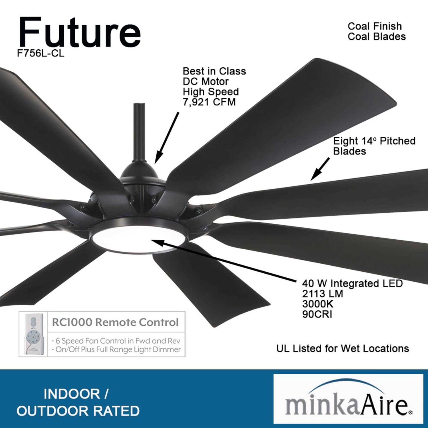 The Minka-Aire Future Coal 1-light 65″ Wide LED Outdoor Ceiling Fan is a stylish and functional addition to any outdoor space. With its sleek design and powerful LED lighting, this ceiling fan provides both cooling and illumination. The Future collection features modern and contemporary designs that are sure to enhance the aesthetic of your space. Perfect for lighting and cooling your patio, porch, or gazebo.