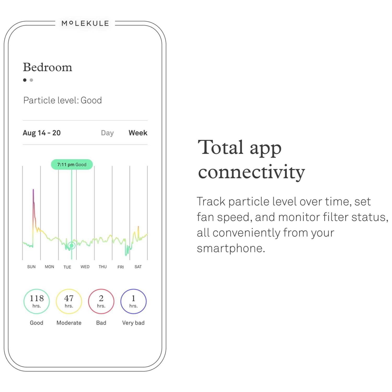 Molekule Air Mini+ purifiers use PECO technology and true HEPA 99.97% particle-capture efficiency rate to capture and destroy pollutants in small rooms and spaces. See your particle level in real time or over time in the Molekule app. Start breathing cleaner air today.