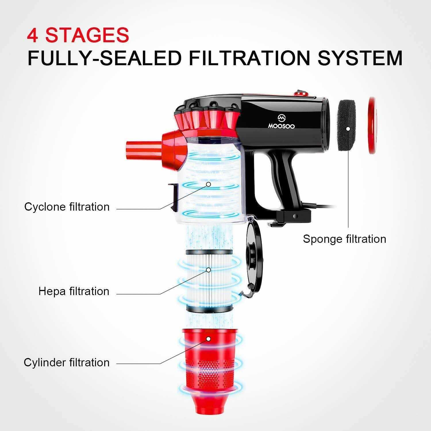 2 Modes Selective: A red button is designed for different cleaning requirements: button upward, good for normal floor cleaning tasks; button downward, the hard brush and soft rubber will drop down, perfect for deeper cleaning. 17Kpa Powerful Suction Moosoo corded stick vacuum Perfect for marble, tile and hardwood floors, pick up all debris, such as cat litter, dog food crumbs, and pet hair. 23FT super long power cord, clean every corner as you like. the best choice for home and office cleaning. Adjustable Tube 19-31 inches adjustable length, retractable tube allows you to freely adjust the length to meet your different needs. easy to reach 10 feet high, such as ceilings and vents, etc. Rotatable Brush Head The brush head is easy to control, feel free to control the direction you want. Flexible joints could free to clean the dirt under the furniture and bed and clean up dead corners. 4 Stages Advanced Filtration System It consists of cyclone filtration, cylinder filtration, high-efficiency filtration, and sponge filtration. It can capture 99.99% of tiny dust and bacteria, providing every user with the ultimate air purification and excellent cleaning experience. HEPA and canister filters are washable. Lightweight & Multi-Versatile Attachments weighs only 4.11 pounds, the vacuum cleaner can be operated with one hand relaxing and is easy to clean from the floor and high places.2-in-1 stick vacuum that easily switches to handheld mode and connects the cleaning brush and crevice nozzle. What you will get -Main Motor -Rotatable Brush Head -Instruction Manual -Wall Mount Tool -Extra HEPA Filter -Cleaning Brush -Crevice Nozzle -Adjustable Extension Tube -Flexible Hose