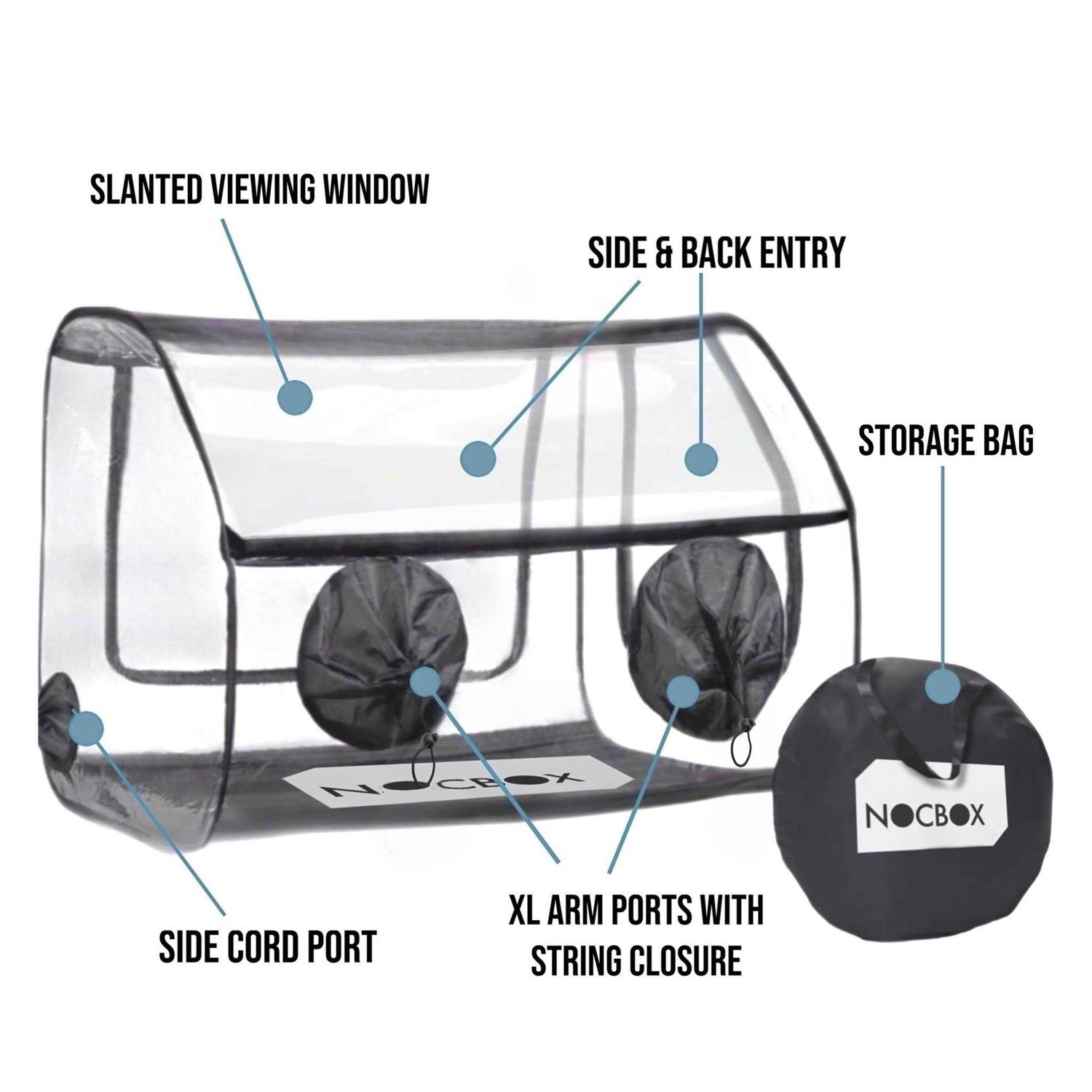 MAKE ANY SURFACE A CLEAN SPACE: Whether you’re inoculating grain bags, working with cultures, cloning mushrooms, or even tackling bigger projects (like spawning a monotub) the restricted airflow inside the NocBox will limit your contact with airborne spores, bacteria, and other microorganisms to improve your overall chances of success. SLANTED VIEWING WINDOW: The slanted front window on the NocBox provides a large viewing area. It also allows you a closer view, which is especially important when working with small items that require precision. ADJUSTABLE FIT ARM PORTS: The entry ports in the NocBox are made from durable multi-layered waterproof fabric. Arm ports are designed to accommodate a wide range of arm sizes, from XS to 3XL. Simply slide arms in and pull the string closure to get the right fit! NO INNER FRAME TO ASSEMBLE: With NocBox, there is no inner frame to pre-assemble. Simply remove it from the storage bag, unfold the clear cover, slide in support bars, and you’re ready to go! This unique design also provides a smooth inner surface for easy cleanup between uses (and fewer places for contaminants to hide!) SIDE PORT FOR CORDED TOOLS & APPLIANCES: Working with a plug-in tool or appliance? No problem! The NocBox has a small port with string closure, allowing you to bring corded tools and appliances inside while still maintaining a clean space. LARGE SIDE & BACK ENTRY DOORS: The NocBox has zippered doors on the side and back so you can easily place items of all sizes inside. This also makes it easy for cleaning between uses.EASY SIDE & BACK ENTRY DOORS: The NocBox has zippered doors on the side and back so you can easily place items of all sizes inside. This also makes it easy for cleaning between uses. LIGHTWEIGHT COLLAPSIBLE DESIGN: The NocBox was designed to be ultra-compact when collapsed and placed into the storage bag. Simply slide out the support bars, fold up the clear cover, and place into the storage bag! Remove any spills using a damp cloth and mild cleanser. Sanitize by spraying with a 70% isopropyl alcohol solution inside and out. Allow ample time to dry. DO NOT use bleach or abrasives. BURN WARNING: DO NOT USE OPEN FLAMES AND/OR HEAT SOURCE INSIDE STILL AIR BOX. Using an open flame and/or heat-generating appliance in a still air box poses a fire risk and may result in accidental burns and vapor ignitions, especially when using flammable liquids or aerosols (including, but not limited to, ethanol and isopropyl alcohol.) Only use an open flame and/or heat-generating appliance in a well-ventilated area. Turn any surface into a clean space! The NocBox Still Air Box is a lightweight, portable, self-contained workspace that lowers your risk of exposure to unwanted contaminants. Whether you’re inoculating grain bags, working with plate cultures, cloning mushrooms, or even tackling bigger projects (like spawning a monotub) the restricted airflow inside the NocBox will limit your contact with airborne spores, bacteria, and other microorganisms to improve your overall chances of success.