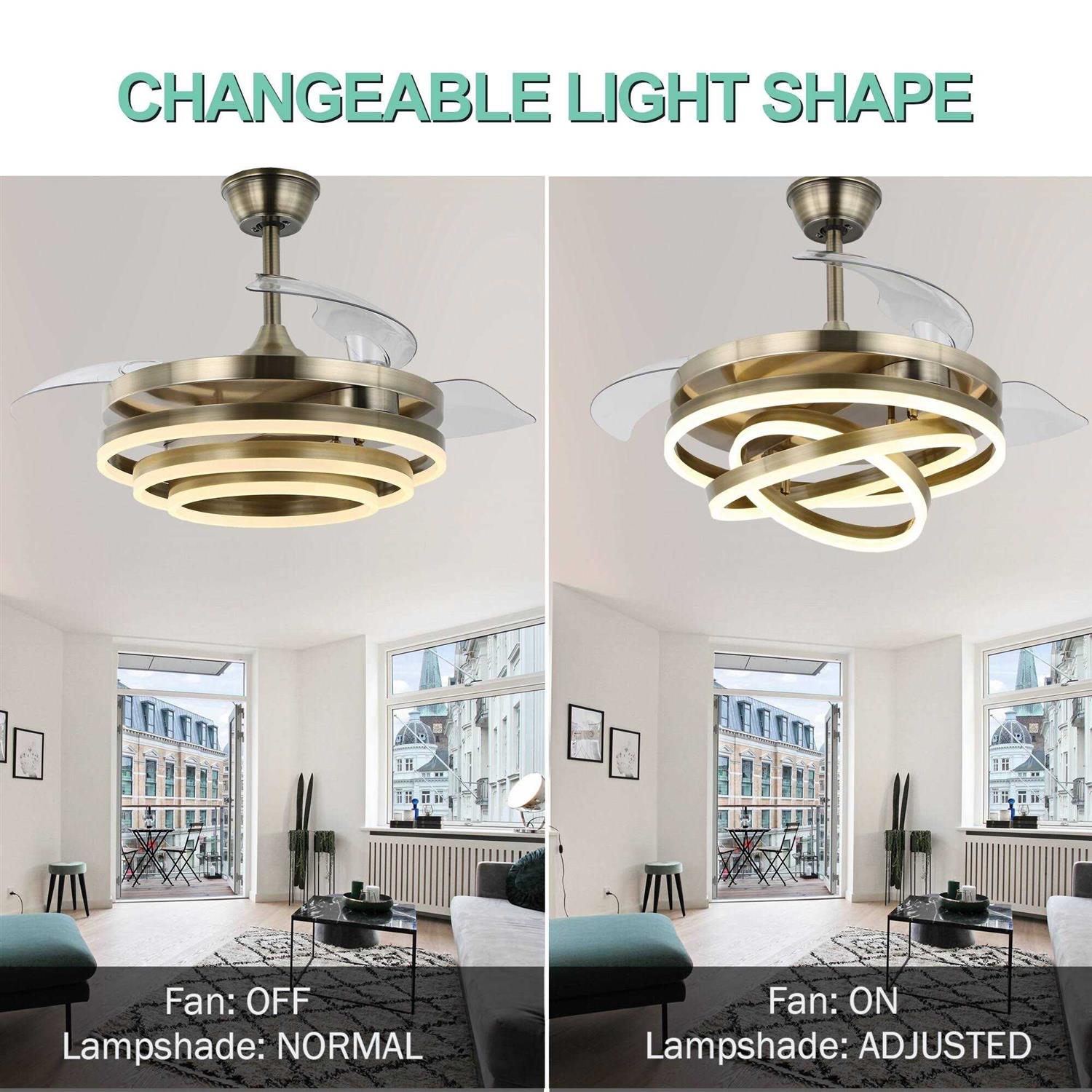 With a brilliant combination of charm and function, designed as a contemporary ceiling fan and a fancy retractable ceiling fan, it brings you sufficient lights and helps to ventilate your room. With the exclusive latest DC motor technology, it guarantees a 65% energy savings compared to conventional AC motor ceiling fans. 6-speed wind and 3-color light modes, all of which can be controlled by a remote. In summer, the air flowing from the ceiling fan creates a fresh breeze. In winter, the ceiling fan distributes the room’s hot air evenly in the opposite direction. For your home life, it provides a comfortable home atmosphere.Details: