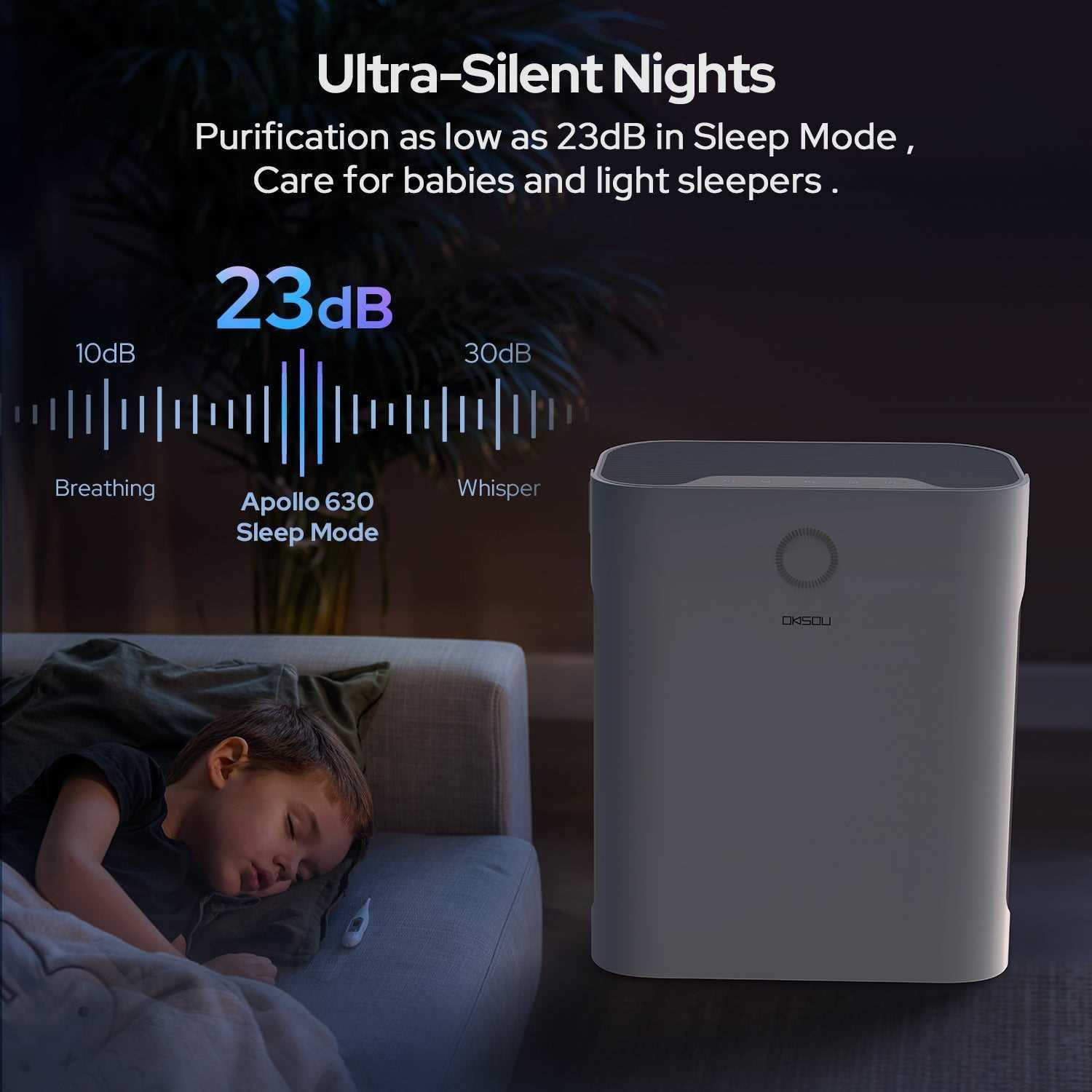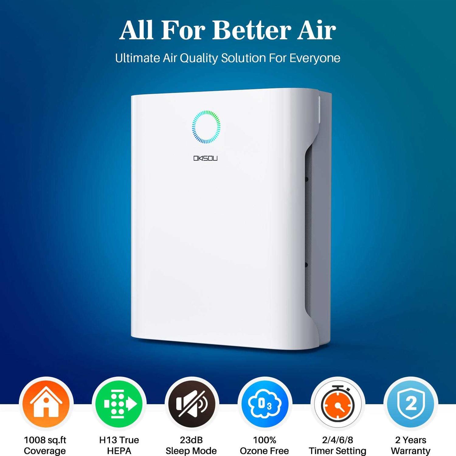 Efficient Air Purification – Refresh Your Air in Minutes: With a high CADR of 130 cfm/220m³/h, our purifier effectively cleans air in large rooms, covering 1008 sq.ft. in one hour, 504 sq.ft. in 30 minutes, 252 sq.ft. in 15 minutes, and 168 sq.ft. in 10 minutes. Compact and lightweight, it’s perfect for rooms of all sizes, including bedrooms, living rooms, offices, basements, family rooms, and kitchens. Powerful 5-Stage Filtration System – Our advanced system includes a Washable Pre-filter, H13 True HEPA Filter, Novel Blue Filter, Honeycomb Activated Carbon Filter, and Cold Catalyst Filter. It captures 99.97% of air pollutants as small as 0.3 microns, such as dust, pollen, smoke, hair, and household odors. Advanced Features – ⁕Sleep Mode ⁕Timer Mode ⁕Filter Replacement Indicator ⁕3 Fan Speed Settings: Conveniently set a timer for 2, 4, 6, or 8 hours. The Filter Replacement Indicator ensures timely filter changes. Adjust to 3 fan speeds for varying environments. The unit’s handle facilitates easy movement, and dual-sided air intake maximizes pollutant capture. The touch screen adds user-friendly control. Quiet Sleep Mode – Minimal Noise, Energy-Efficient: Operate the OKSOU Air Purifier all night with Sleep Mode. Running at the lowest fan speed (only 23dB) with the display off, it cleans your air without disrupting your sleep. Sleep mode is exceptionally energy-saving, making it ideal for quiet and clean ambiance during sleep, study, work, or any peaceful moments.