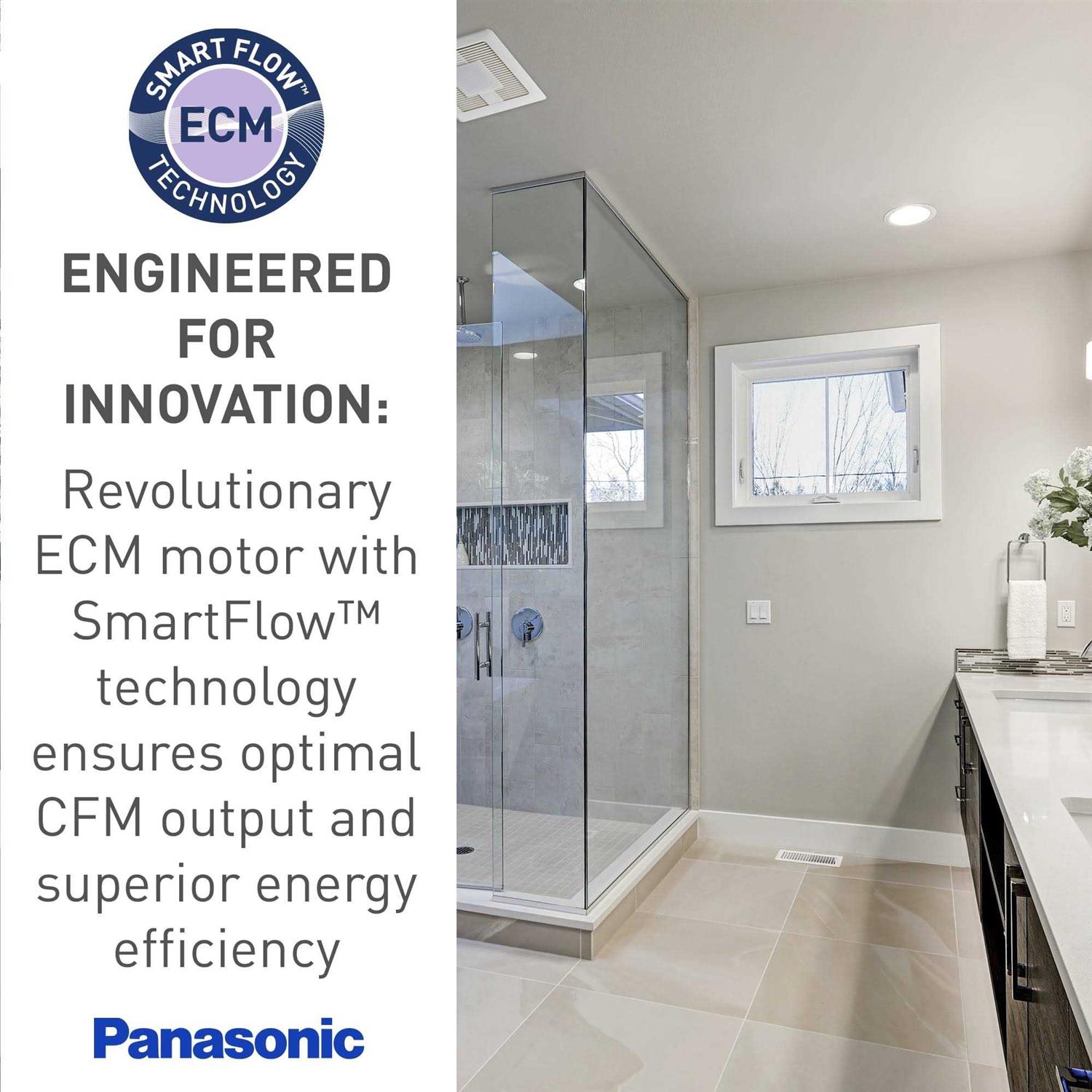 Precision Spot Ventilation Fan – Power of Performance Efficiency Perfected WhisperCeiling DC comes from a line of time-tested and customer approved quiet yet powerful and energy efficient ventilation fans. This precision spot ventilation solution improves IAQ by effectively removing moist polluted air from your bathroom laundry room sun room basement or garage. ECM Motor with SmartFlow Technology WhisperCeiling DC is designed to perform as rated. When the fan senses static pressure its speed is automatically increased to ensure optimal CFM output. This feature provides peace of mind as the installer doesnt have to worry about compromising the fans performance even with a complicated duct run. Pick-A-Flow Speed Technology Built-in Pick-A-Flow speed selector provides the unique ability to select your required airflow 50-80-110 CFM with the simple flip of a switch. Long Life Means Reduced Costs When you have a household or business to run you don’t want to have to replace little things like a vent fan. Panasonic fans use less energy to move larger volumes of air than other brands. Consequently Panasonic fans run cooler so they last longer. They are also much less likely to overheat and result in motor failure. The motor is also equipped with a thermal-cutoff fuse. Installation Flexibility The Flex-Z Fast Installation Bracket with articulating joints is ideal for positioning the fan exactly where you want it in old or new construction. WhisperCeiling DC incorporates an integrated dual 4 in. or 6 in. duct adapter to give you flexibility in duct layout and design. Static Pressure in inches w.g.