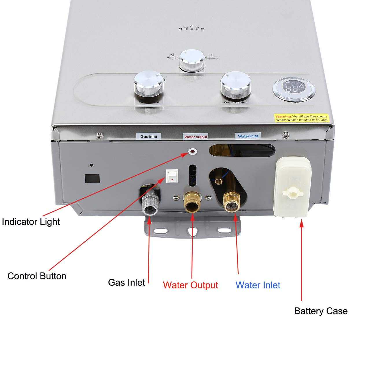 Minimum working water pressure: 0.025MPa; Max.0.8MPa; Automatic electric ignition powered by 2 qualified D batteries Hot Water Output (T=25 degree):12 L/min, Gas Type: LPG; Suitable gas pressure: 2800Pa (0.4 psi ) Over heat Protection: Over 75 °C will automatically turn off . Built-in 20 minute timer for safety protection, it will automatically turn off after 20mins of use. BATTERIES AND NTP ADAPTERS ARE NOT INCLUDED. Youtube video code for installation: lJkKK8QDZVo /b br br Feature: /b br High efficient energy saving br Low water-pressure startup br 20 minute timer protection br Over Heat protection function br Over water pressure protection function br Exhaust way: Open & Force Flue Exhaust Type br Discharge ways: Flue automatic gas discharge br Fire catching ways: Electricity pulse automatic fire catching br Automatic electrical pulse ignition system, Flame failure protection device br Mains power not required, powered by two 1.5V batteries (No batteries Included) br br Specification: /b br Gas Type: LPG Liquid Petroleum Gas (PROPANE) br Hot water output :12 L/min br Heat output power : 24 KW br Suitble water pressure: Min.0.02MPa. Max.0.8MPa, Starting Pressure:0.025MPa br LPG gas pressure: 2800Pa (0.4PSI) br Water pipeline spec.: br Cold water pipeline : Short pipeline equipped or G thread 1/2″ Steel Tube br Warm water pipeline : Long pipeline equipped or G thread 1/2″ Steel Tube br Gas pipeline (Outer diameter) : 20 mm/0.79″ rubber gas hose br Smoke exhaust pipe output dia. (Not included):105mm/4.13″ br Product dimension :23.2″x 13.4″x 5.9″ / 590x340x150 br br Package Included: /b br 1x LPG Water Heater br 1x Shower Kit br 1x English User Manual br br Please notice: Not included Exhaust Pipe br Pipe thread for gas and water valves are not American, you may need to buy some NPT adapters br User manual can be sent via email.