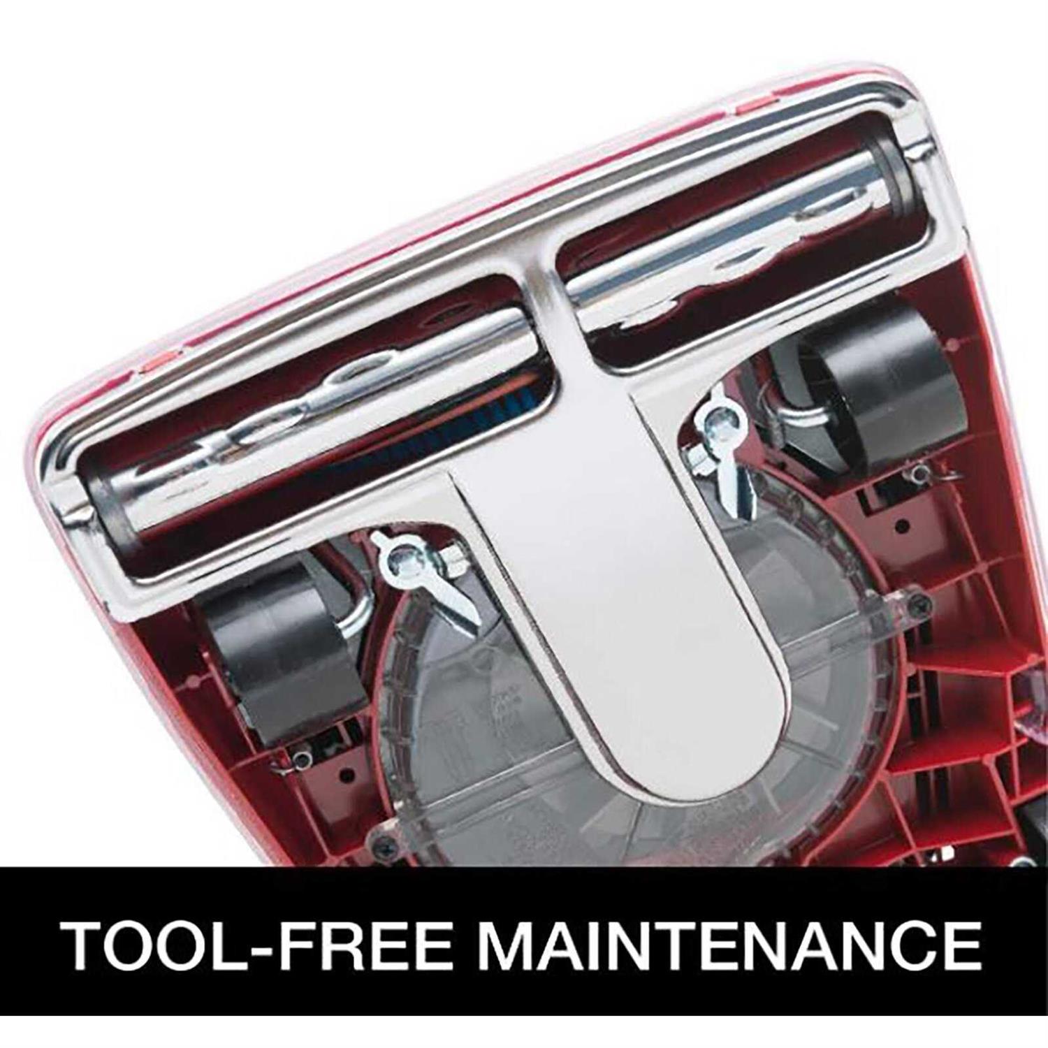 Upright vacuum features a chrome hood for added durability that holds up in the toughest environments. 2,000-hour motor and chrome brush roll with replaceable bristle strips reduce the cost of ownership. Quick-Kleen fan chamber helps diagnose and clear clogs for easy maintenance. Increase productivity with less downtime with its large-capacity, 18-quart shakeout bag and 50′ quick-change, pigtail cord. Looped handle provides added comfort and maneuverability.