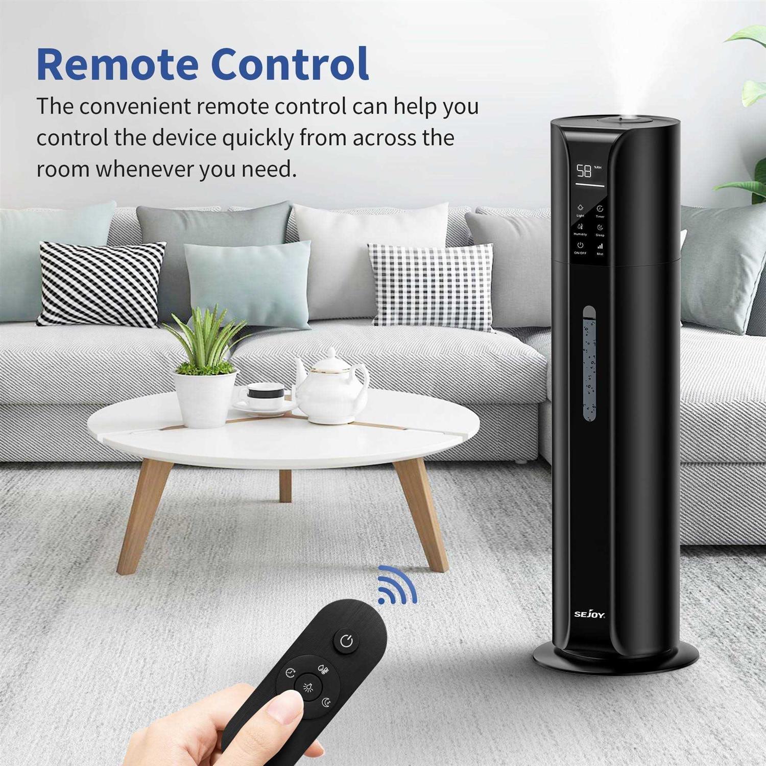 Newly upgraded with all the convenience of the design 1. The home humidifier water tank is designed at the bottom, with a low center of gravity, which is not easy to knock down. 2. The control panel has been moved to the top for easy reading and easier manual operation. 3. Top filling: The large cool mist humidifier allows you to fill the tank directly from the top without disassembling. 4. 0-14 hours timer function, used to set the running cycle. 5. LED control panel, easy to set humidifier even in the dark. 6. Large removable water tank for easy daily cleaning. 7. Convenient remote control can help you quickly control the device from across the room when needed. 9L/2.4Gal Large Tower Humidifier Sejoy whole house humidifier use ultrasonic technology to transport mist. The water is atomized into ultrafine particles, and the mist diffuses into the air through the air flow device. It can help protect our furniture from dryness, especially in winter or summer air-conditioned rooms to relieve dry skin and throat, reducing the generation of static electricity. You can add your favorite essential oils to the aroma box and enjoy wonderful, fresh-smelling air.