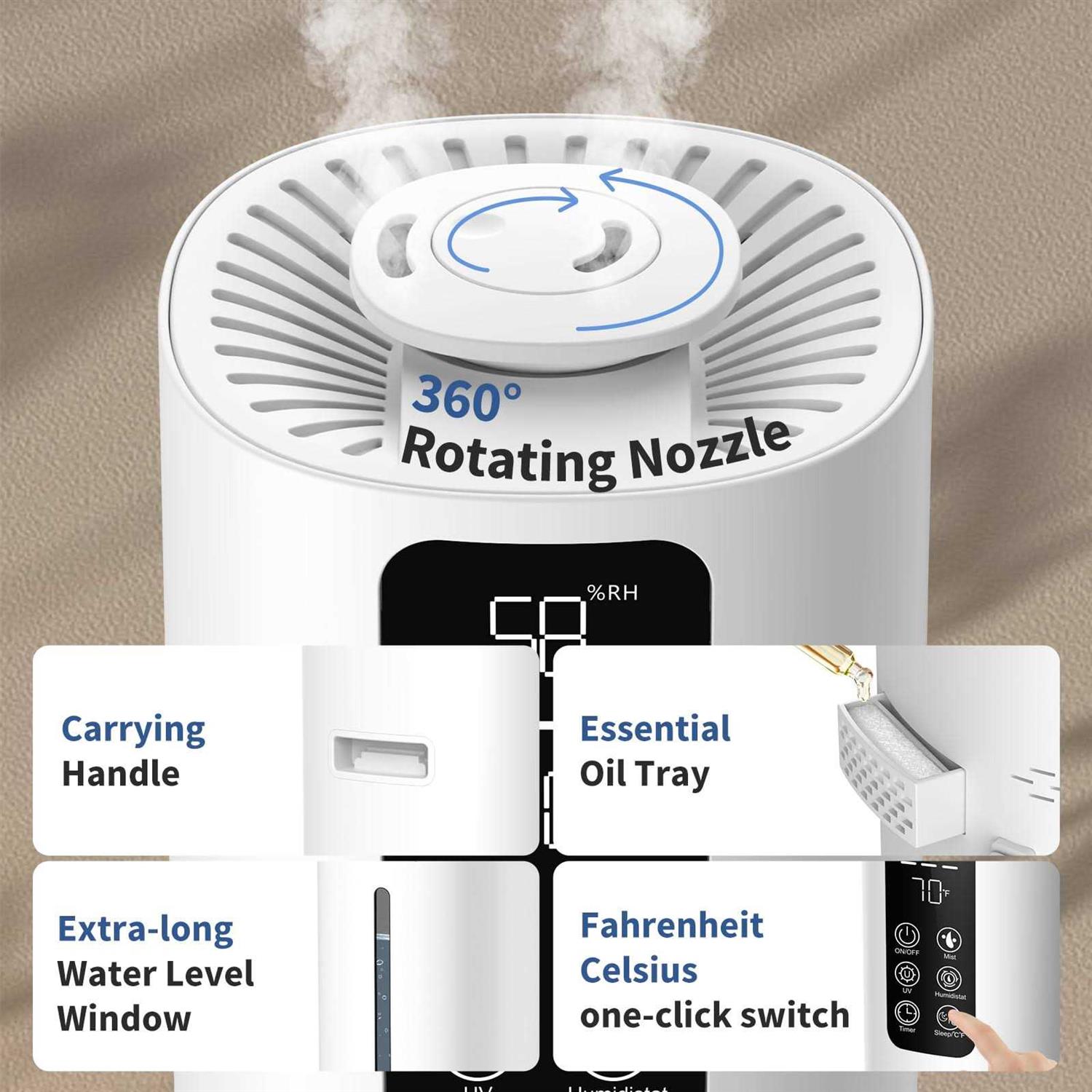 Humidifiers for Large Room & Bedroom: The 2.11-gallon(8L) ultrasonic humidifier is designed for large rooms up to 500 sq ft & long lasts for 24 hours humidification between refill. Best whole house humidifiers for home, bedroom, dorm and living room. Top Fill Humidifiers with Essential Oils Tray: With detachable water tank, you can easily open the lid to add water from top or just put the water tank under the faucet. Add your favorite essential oils to the tray on the back of the humidifier to relax and enjoy the atmosphere you prefer. Customized Humidity & 3 mist level: The humidifier is equipped with humidity sensor, which offers a smart adjustable humidistat, also with 3 levels of humidification which you can adjust manually. Maximum mist of 300mL/h. Easily customize your desired humidity. Whisper Quiet & Water Shortage Protection: The cool mist humidifier runs below 38dB, turn on sleep mode at night, the screen goes out while quiet misting still working. Also automatically turns off when it runs out of water. Safe and reliable. Remote Controller & Timer: The air humidifier features a remote controller and a 12H Timer, so you can easily control it at your large room. It is also a ideal commercial humidifier, suitable for school, hotel, office. Humidifiers for Bedroom Large Room 8L Cool Mist for Families Plants with Built-in Humidity Sensor, Essential Oil, Air Vaporizer