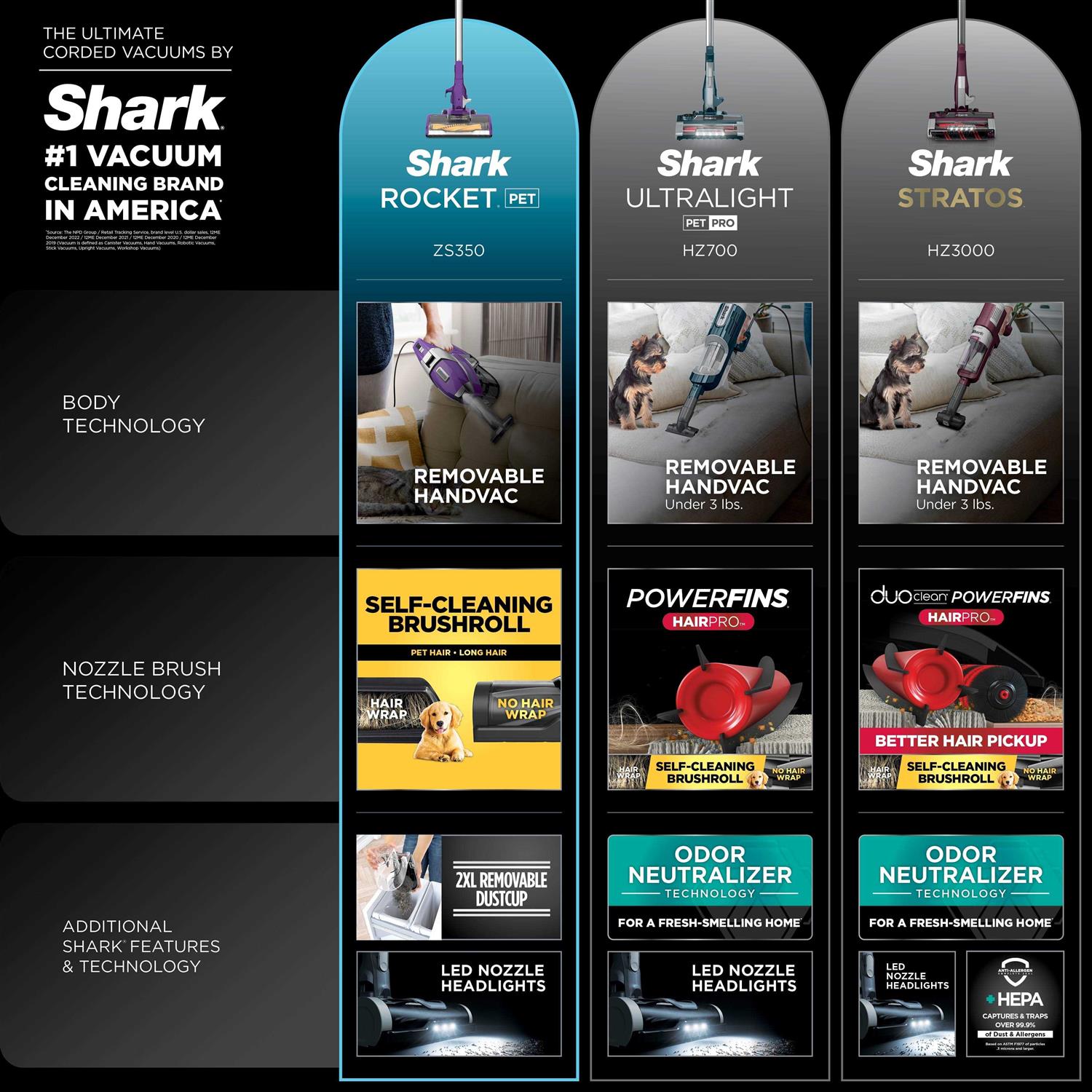 With Zero-M, this ultra-lightweight stick vacuum cleaner features powerful Shark suction and outstanding cleaning performance while delivering nonstop hair removal with a self-cleaning brushroll. The Shark Rocket Zero-M cleans hard floors and deep-cleans carpets, and easily converts to a handheld vacuum for versatile floor-to-ceiling cleaning. Features include a removable XL-capacity dust cup, and Advanced Swivel Steering. Converts to a handheld vacuum to easily clean stairs, furniture, and other above-floor surfaces. Its slim design is perfect for reaching high up and in between narrow spaces using the quick-release foot pedal to separate the floor nozzle. Easily spot hidden dirt with bright LED lights located on the nozzle. MultiFLEX Technology folds over for compact, free-standing storage and provides flexible reach to get under beds, couches, and tables. Weighing under 10 pounds, this lightweight vacuum has a removable dust cup for easy emptying and a brush roll garage for quick and easy access from the top of the vacuum. With a generous, 30-foot power cord, it never loses power.
