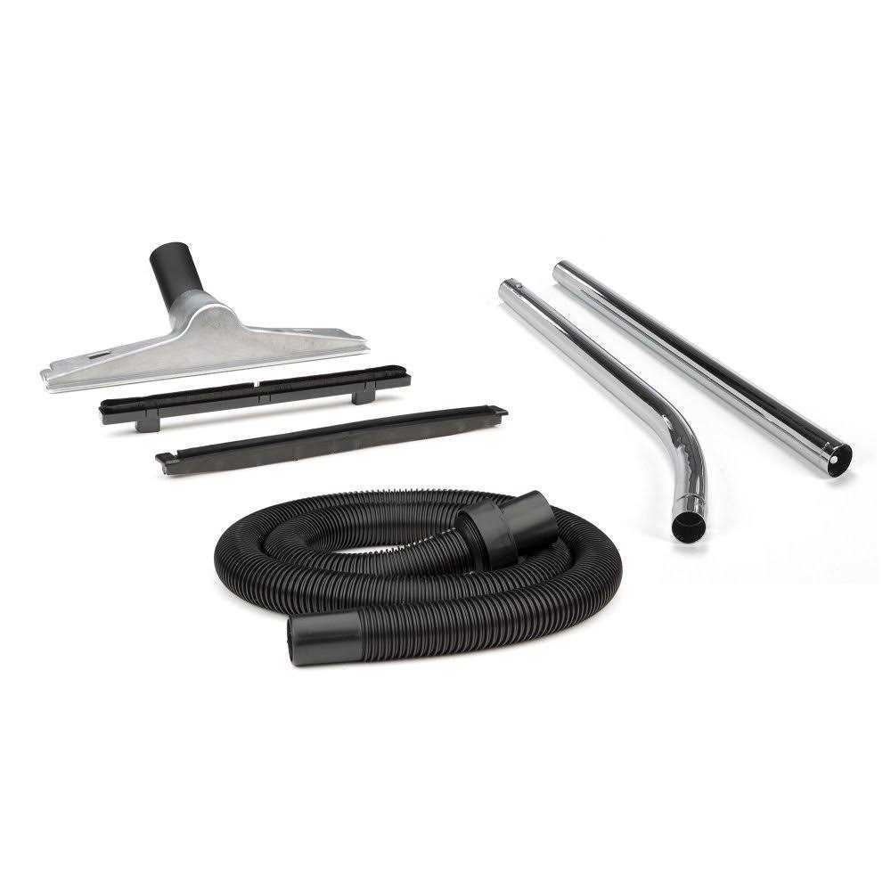 The heavy-duty stainless steel tank construction is built to last in workshop and garage settings. With a powerful 6.5 peak hp motor that provides an airflow rating of 110 CFM, this vacuum will be the workhorse of your cleaning operation. The tool kit includes a lock-on hose, metal nozzle, brush insert, squeegee insert, tool storage basket, and two extension wands, preparing you for any cleaning situation. Plus, the power cord is 20′ so that you do not have to be right next to a power source. This model has a blower feature that allows you to attach the hose to the rear blower port and blow dirt or grass away from your establishment. Plus, the tank drain feature makes it easy to drain the tank when finished cleaning. The filter system includes an Ultra-Web cartridge filter, foam sleeve, and a high-efficiency disposable filter bag. This unit requires a 120V electrical connection for operation.