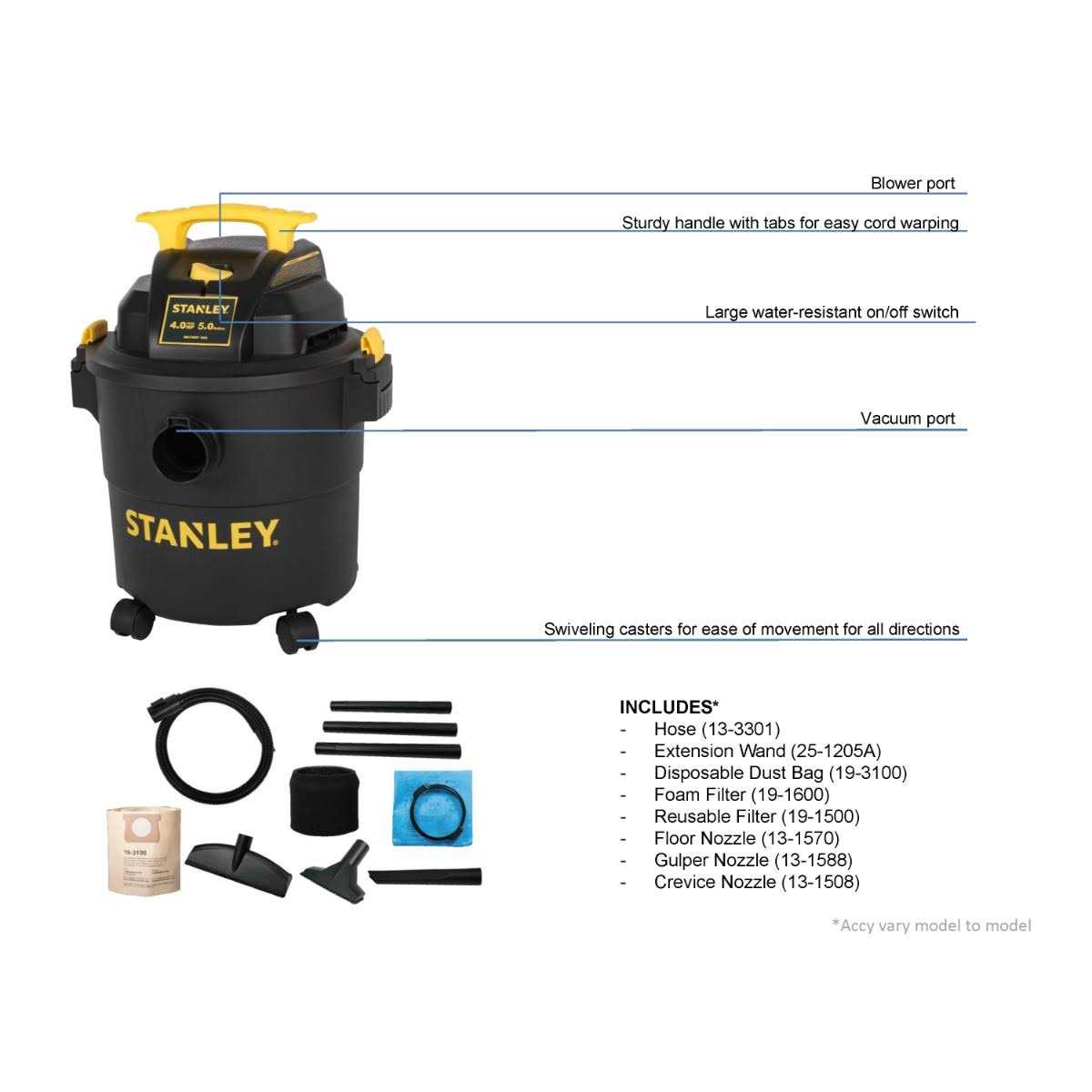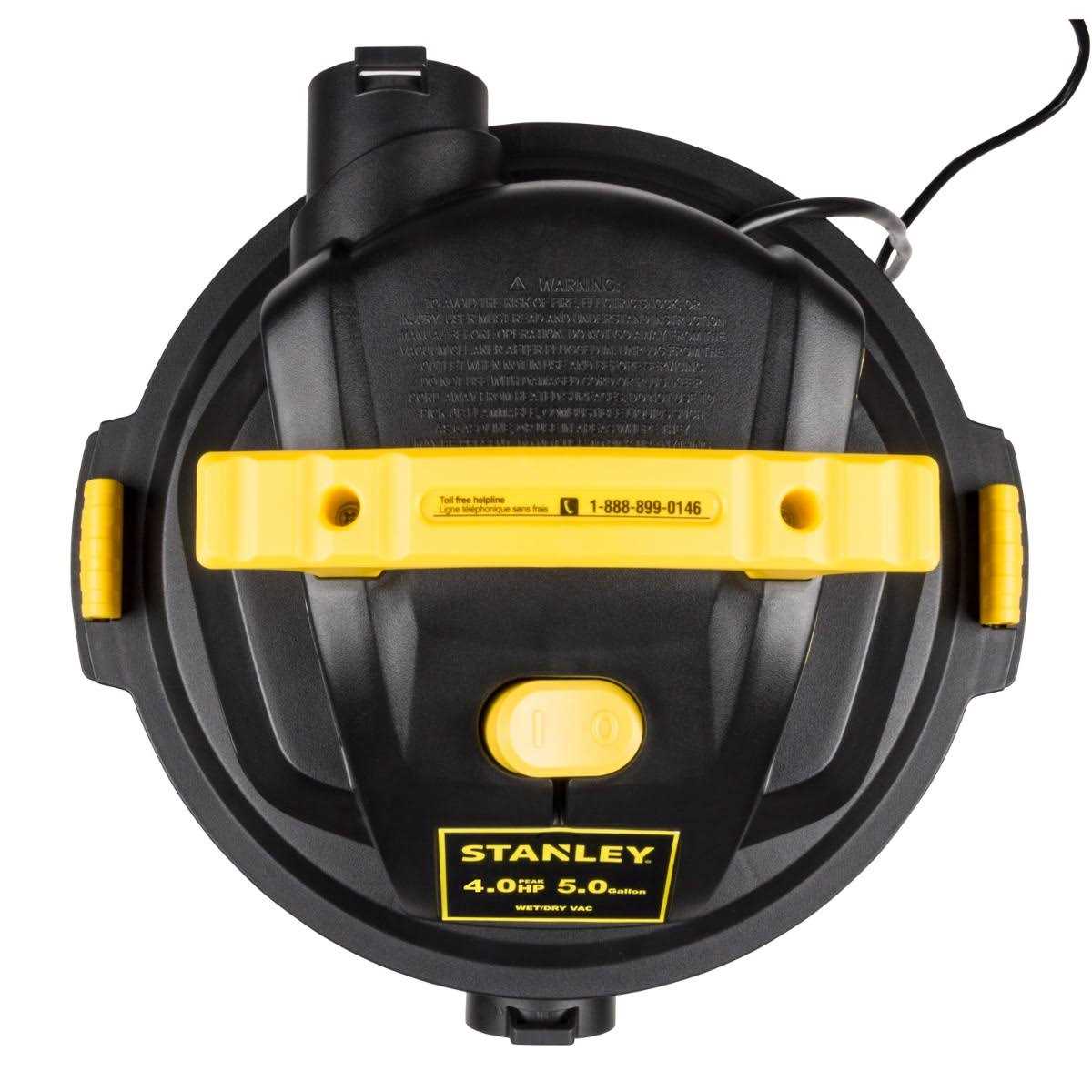 The Stanley 5-gallon wet/dry vacuum features a powerful motor for industry leading performance providing maximum suction power for heavy-duty pickup. Great for both wet and dry pickups. The powerful blower port instantly converts the wet/dry vacuum into a power blower. Strong handle for easy carrying. Large on/off switch with water-resistant design for safe and quick access. Convenient built-in power cord wrap. Accessory storage casters keep your tools organized and provide ease of movement in any direction. Built-in tank drain makes draining easy. Stanley wet/dry vacuums provide superior performance in any environment. From a portable wall-mounted 1-gallon 1.5 peak HP wet/dry vacuum great for a variety of clean-up tasks in any room at home and the garage to the rugged 14-gallon 6.5 peak HP stainless steel wet/dry vacuum for heavy-duty use Stanley wet/dry vacuums make short work of even the toughest jobs saving you time and effort.