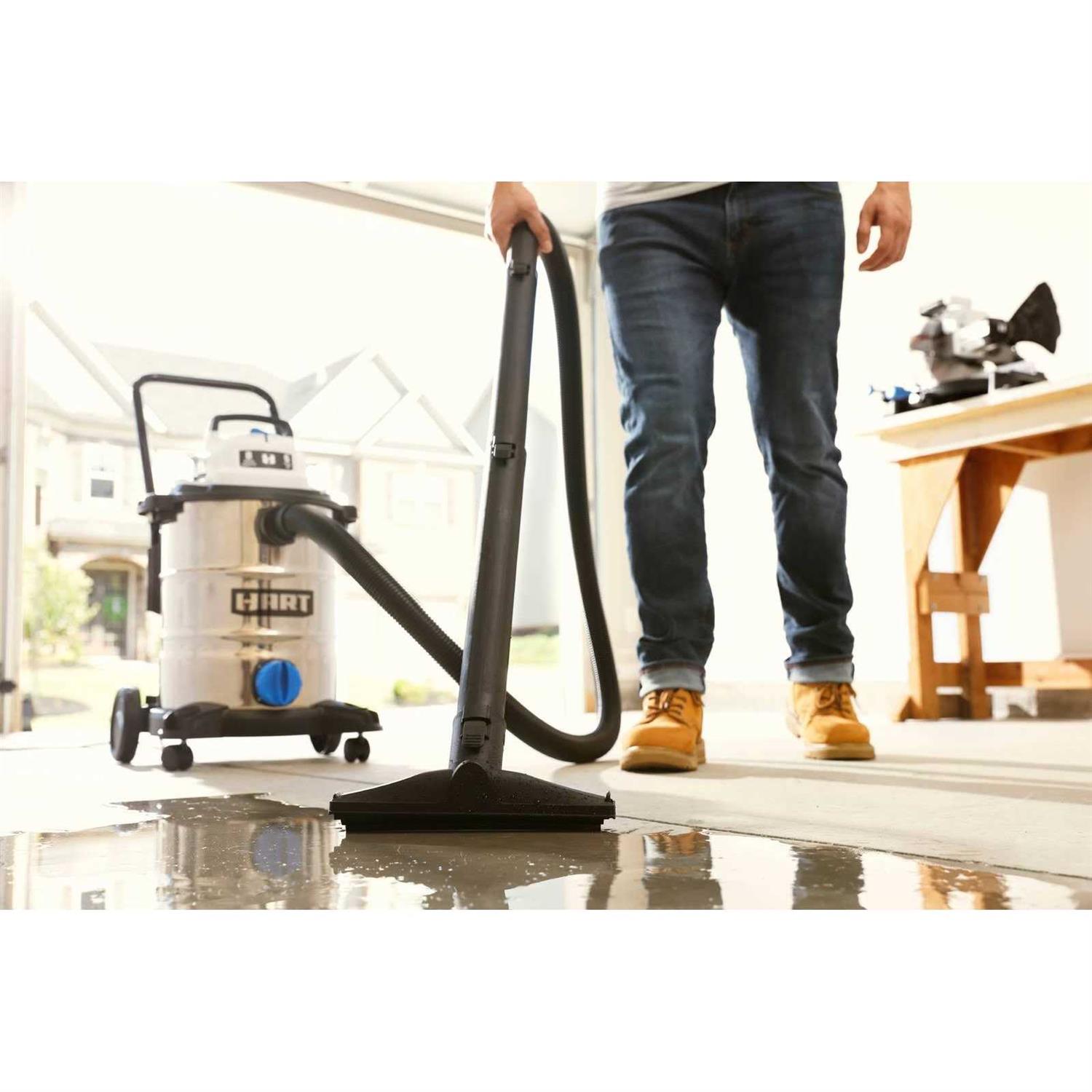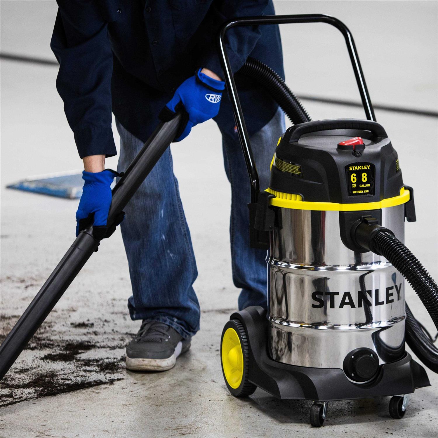 The Stanley stainless steel 8 gal. wet dry vacuum features a powerful heavy-duty motor for industry leading performance, providing maximum suction power for heavy-duty pickup. Great for both wet and dry pickups, this powerful blower port instantly converts the wet dry vacuum into a power blower. It features a strong handle for easy carrying, large on/off switch with water-resistant design for safe and quick access, convenient, built-in power cord wrap, accessory storage casters that keep your tools organized and provide ease of movement in any direction, and a built-in tank drain makes draining easy. Stanley wet dry vacuums provide superior performance in any environment. Great for both wet and dry cleaning projects. Rear blower port design converts the wet/dry vacuum into a powerful blower. Swiveling front casters provide ease of movement in any direction. High performance cartridge filter for wet or dry pick up. Built-in cord wrap and accessory holder keep all accessories organized.